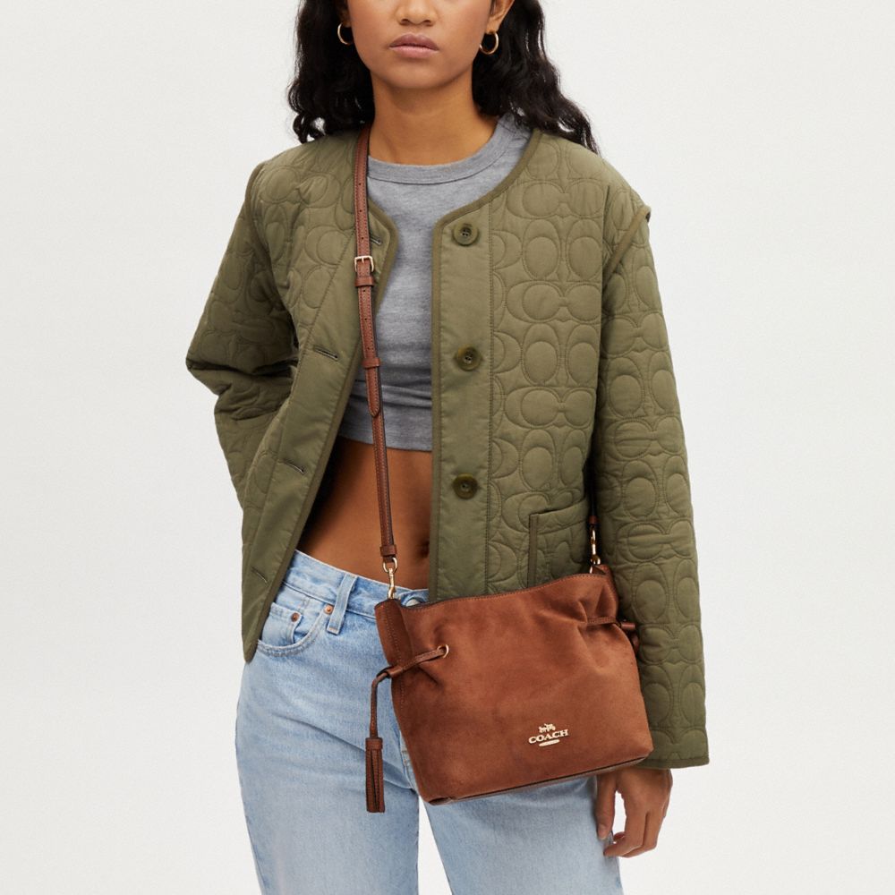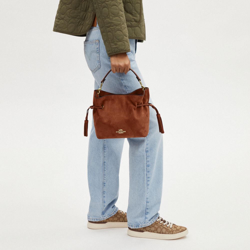 | Suede and refined pebble leather | Inside zip and multifunction pockets | Drawstring and magnetic snap closures, fabric lining | Detachable handle with 5 1/4" drop | Detachable strap with 21" drop for shoulder or crossbody wear | 9 1/2" (L) x 7 3/4" (H) x 3 3/4" (W)|Style No. CM091|
