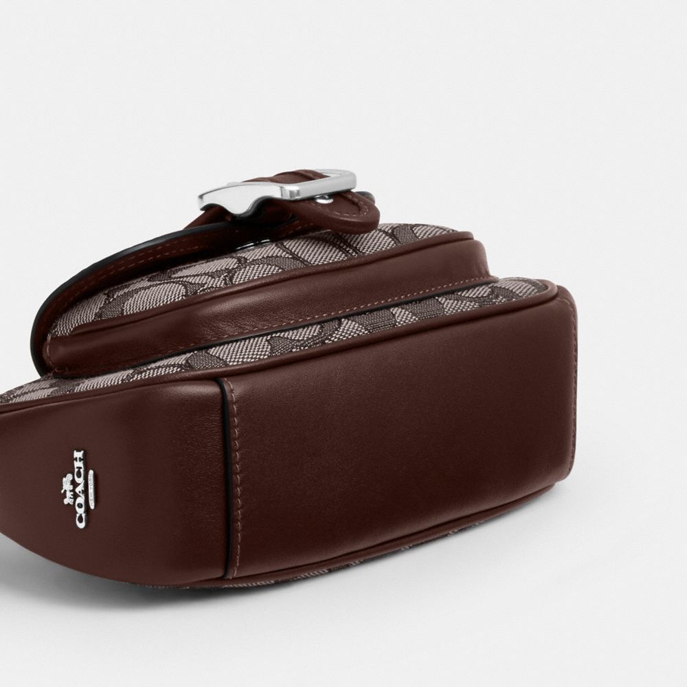 Signature jacquard and shiny smooth leather| Zip-top closure, fabric lining| Detachable handle with 8 1/2" drop| Outside snap pocket| Detachable strap with 22 1/2" drop for shoulder or crossbody wear| 7 3/4" (L) x 3 1/2" (H) x 2 1/4" (W)| This Coach piece is crafted of our Signature jacquard made from a blend of regenerative cotton and recycled polyester|Style No. CDB18