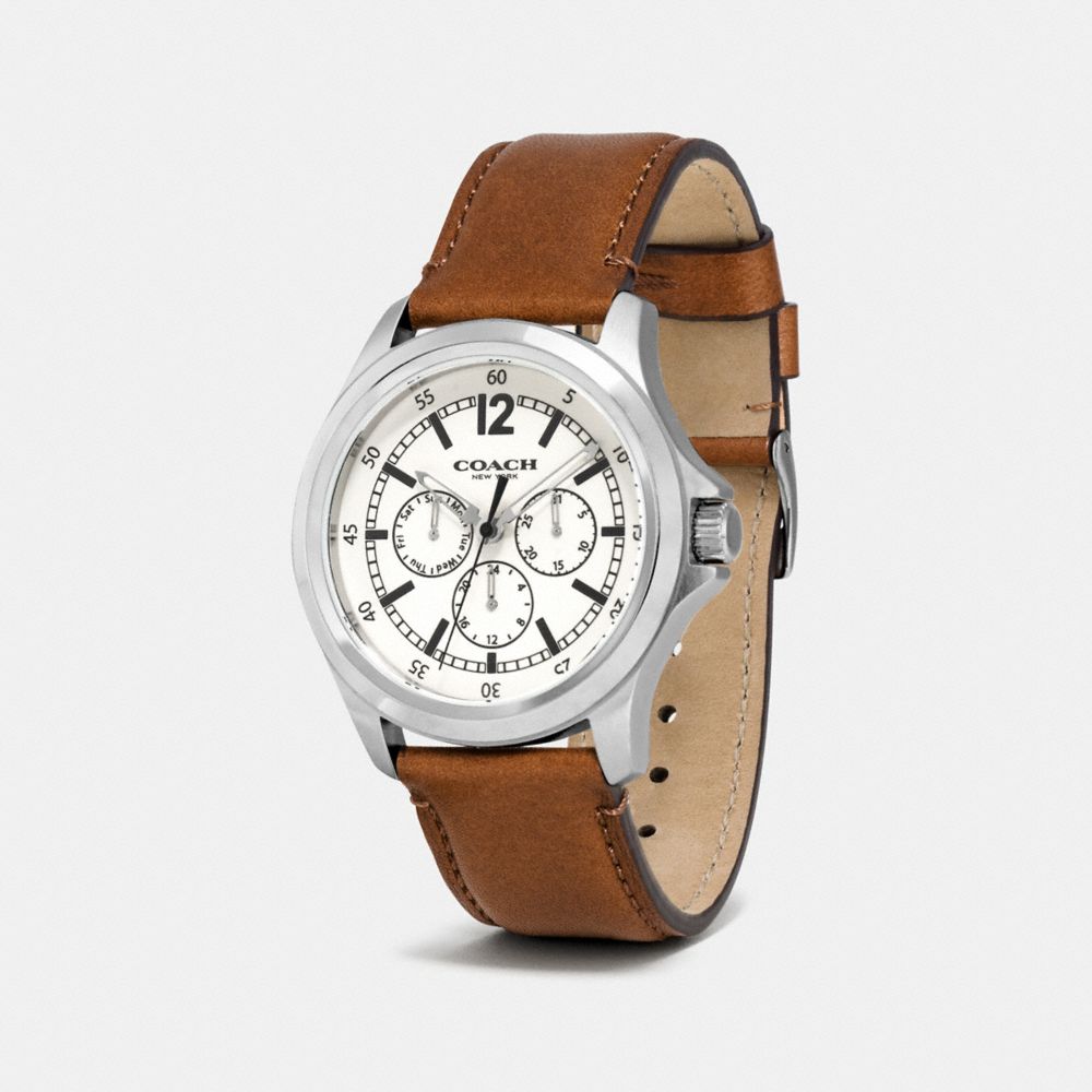 COACH FACTORY OUTLET PRICE CHART - W5012 - BARROW STAINLESS STEEL MULTIFUNCTION LEATHER STRAP WATCH - PARCHMENT/SADDLE