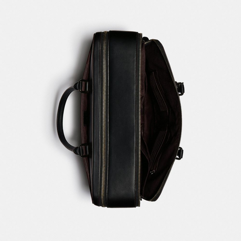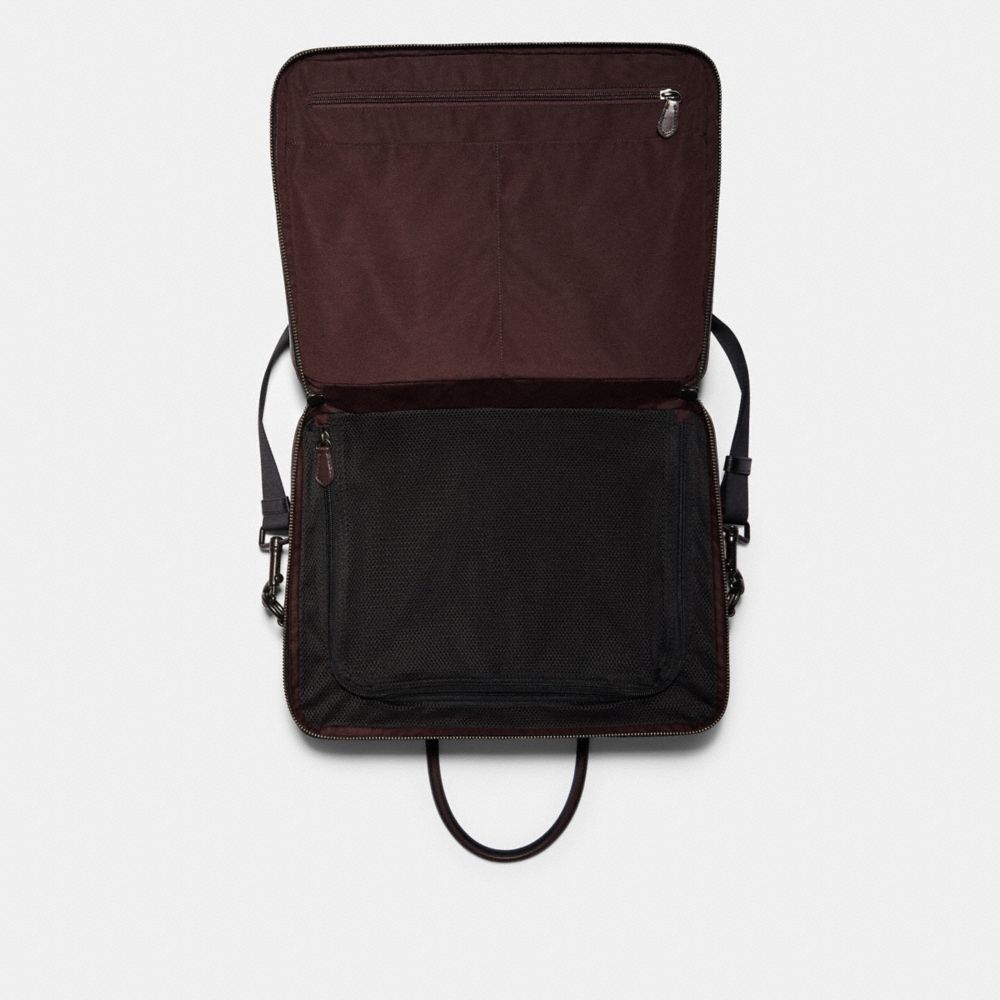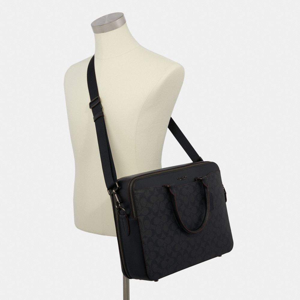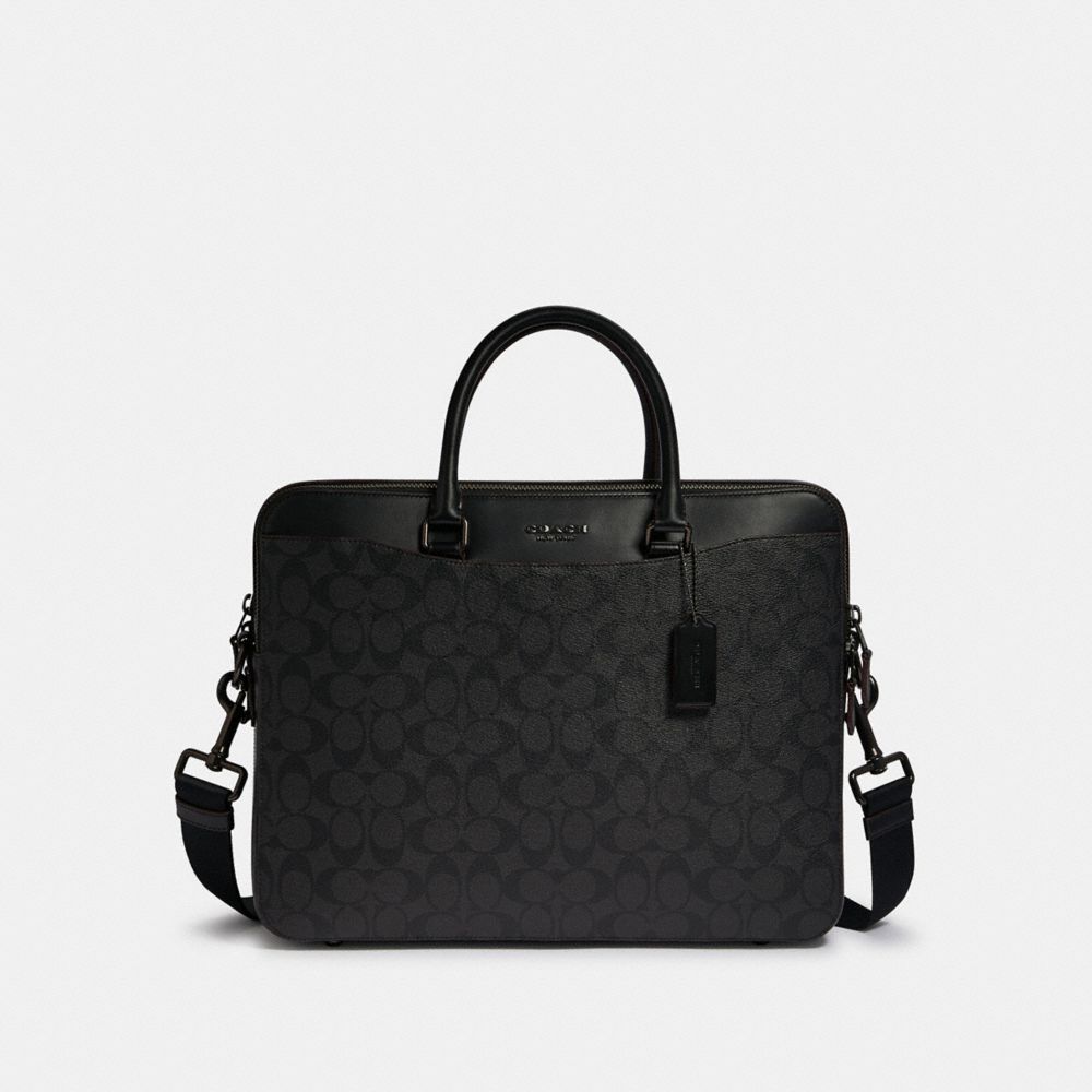 Signature coated canvas and refined calf leather| Twelve credit card slots| Inside zip and multifunction pockets| Inside laptop sleeve with secure tab| Two interior compartments| Zip closure, fabric lining| Handles with 4 3/4" drop| Outside slip pockets| Detachable strap with 25" drop for shoulder or crossbody wear| 15" (L) x 11 1/2" (H) x 4 1/4" (W)