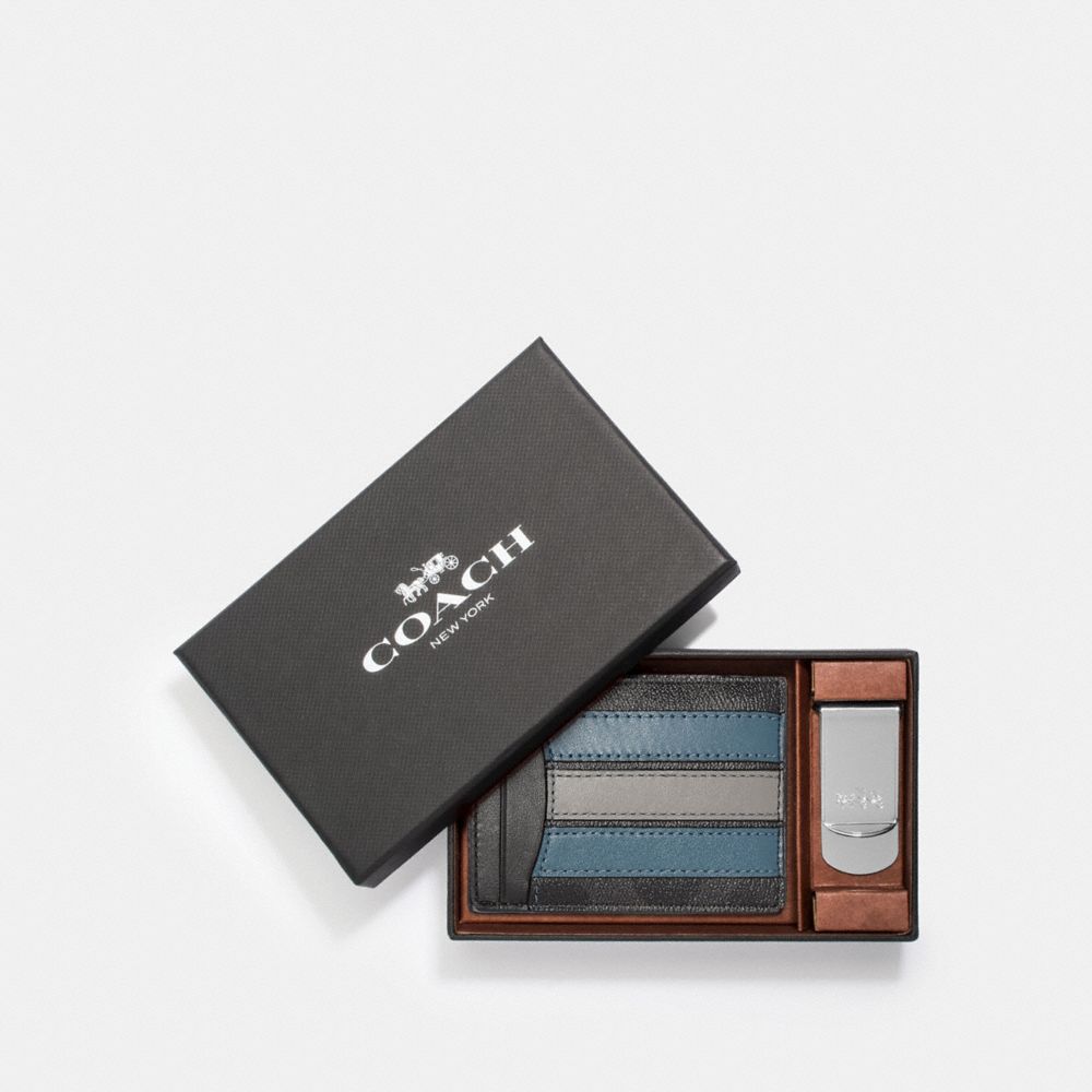 BOXED 3-IN-1 CARD CASE GIFT SET IN SIGNATURE CANVAS WITH VARSITY STRIPE (COACH F37945)