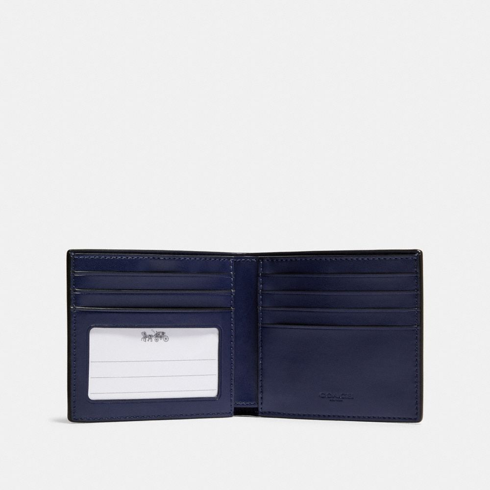ID billfold wallet:| Signature coated canvas and smooth calf leather| Six credit card slots| Full-length bill compartment| ID window| 4" (L) x 3" (H) x 1/2" (W)| Valet key fob:| Smooth calf leather| Snap closure| Attached split key rings and dogleash clip| 3/4" (L) x 2 1/2" (H)| Packaged in a Coach gift box
