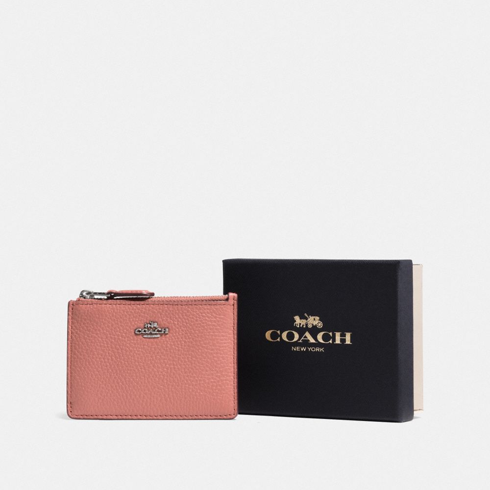 Polished pebble leather| Credit card slot and ID window| Zip-top closure, fabric lining| Attached split key ring| 4 1/4" (L) x 3" (H)| Packaged in a Coach gift box