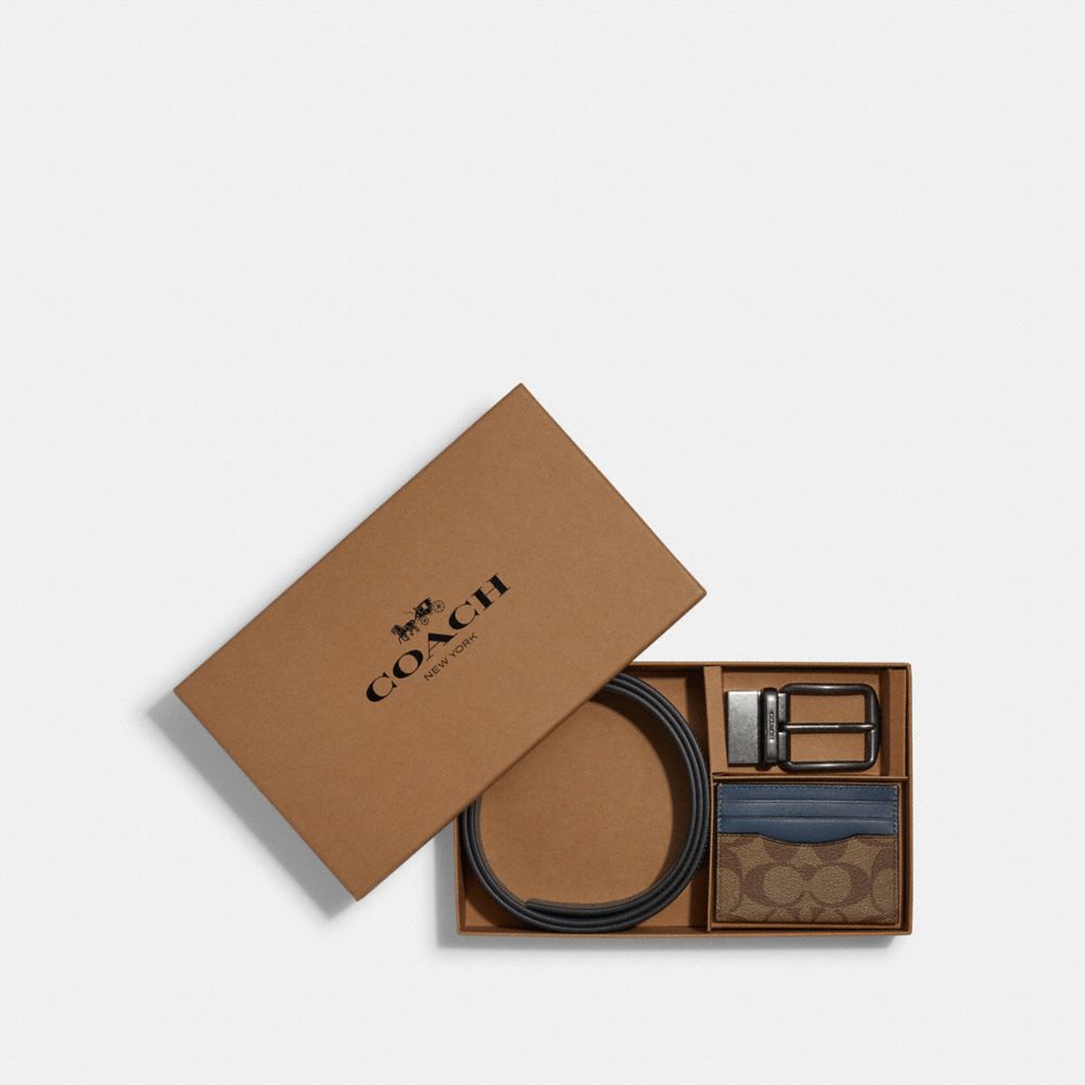 COACH FACTORY OUTLET PRICE CHART - C8278 - BOXED CARD CASE AND BELT GIFT SET IN COLORBLOCK SIGNATURE CANVAS - GUNMETAL/KHAKI/DENIM