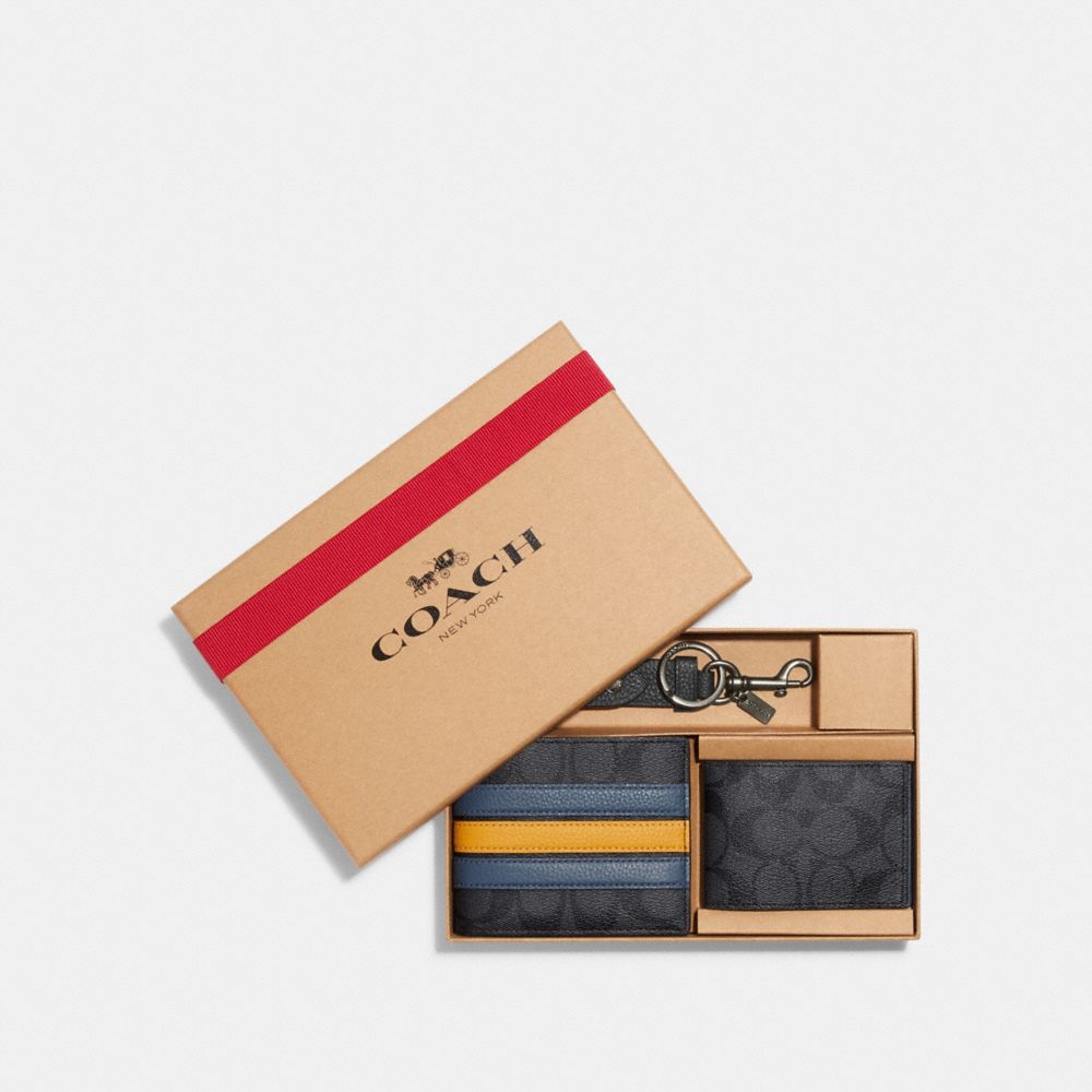 COACH FACTORY OUTLET PRICE CHART - CE549 - BOXED 3 IN 1 WALLET GIFT SET IN SIGNATURE CANVAS WITH VARSITY STRIPE - GUNMETAL/CHARCOAL/DENIM MULTI