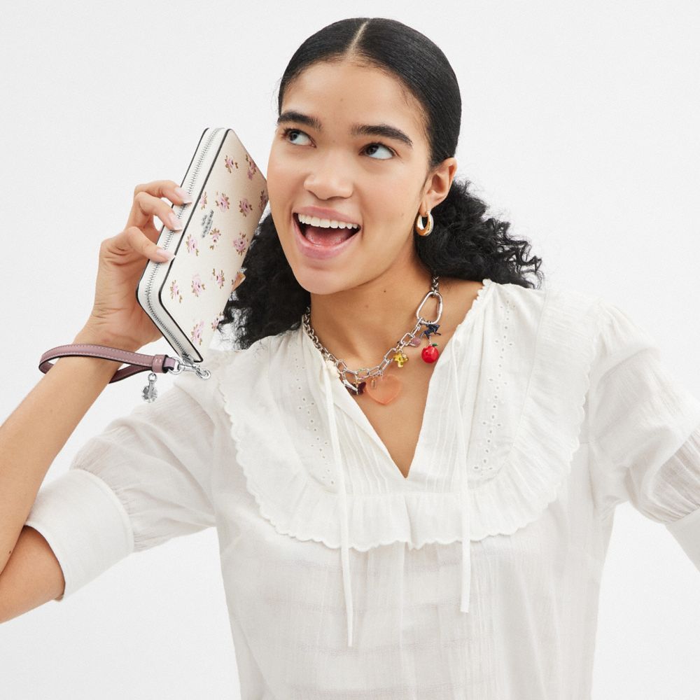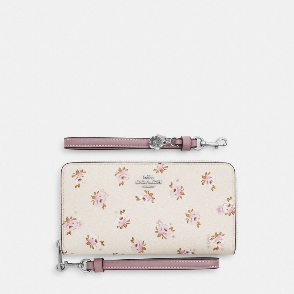 | Printed coated canvas | 12 credit card slots | Full-length bill compartments | Inside zip coin pocket | Zip-around closure | Detachable wrist strap | 7 1/2" (L) x 4" (H) x 1" (W) | Fits all iPhone and Samsung Galaxy phones | Includes interchangeable strap with charm | Packaged in a Coach gift box with ribbon|Style No. CAV57|