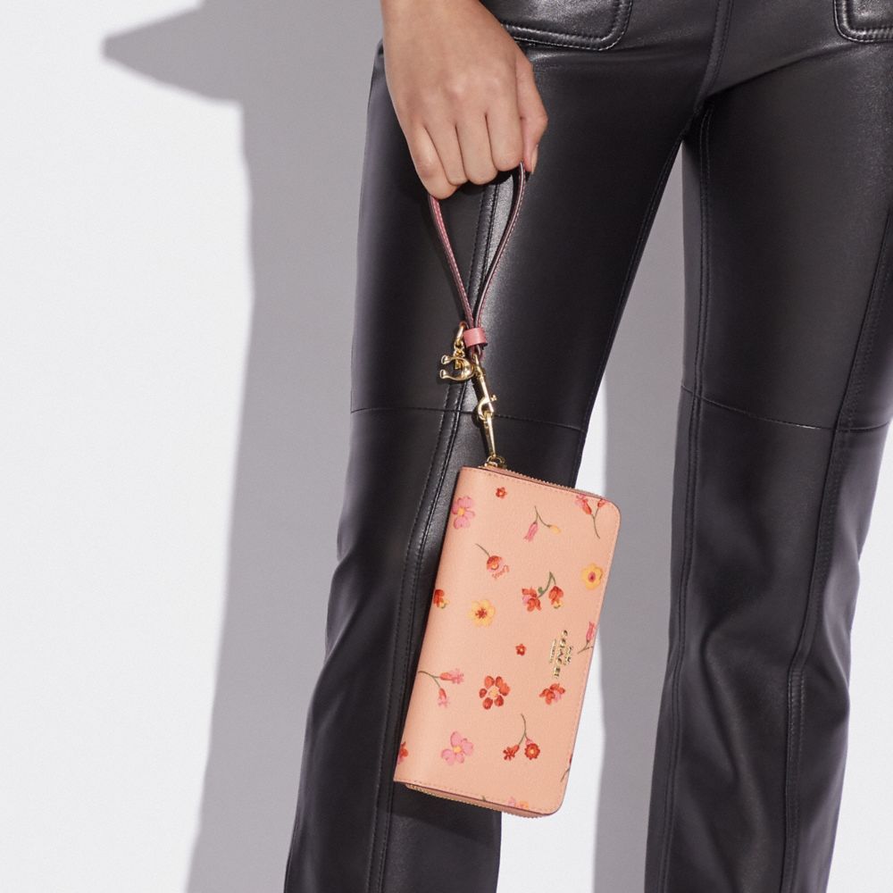 Printed coated canvas and smooth leather| Twelve credit card slots| Full-length bill compartments| Inside zip coin pocket| Zip-around closure| Detachable wrist strap| 7 1/2" (L) x 4" (H) x 1" (W)| Fits all iPhone and Samsung Galaxy phones| Includes interchangeable strap with charm| Packaged in a Coach gift boxStyle No. C9714