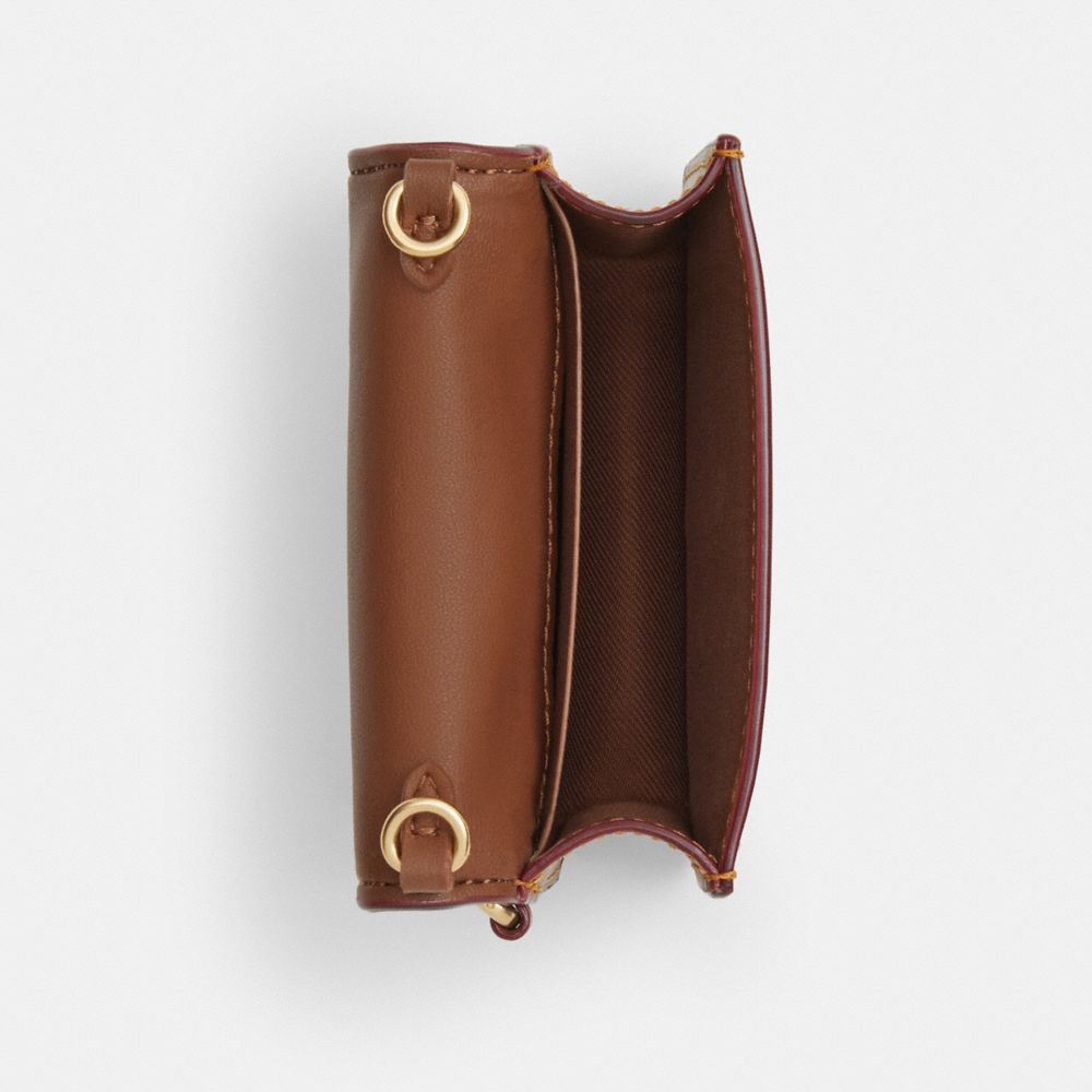 | Signature coated canvas and smooth leather | Two credit card slots | Snap closure, fabric lining | Outside open pocket | Detachable chain strap with 23 1/4" drop for shoulder or crossbody wear | 4" (L) x 3" (H) x 1" (W) | Includes removable charms | Packaged in a Coach gift box with ribbon|Style No. CR949|