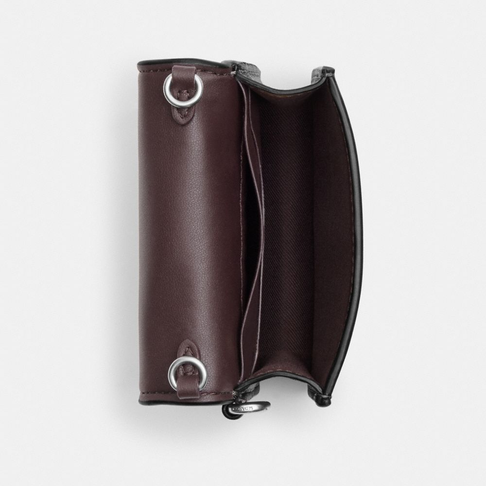 | Signature coated canvas and smooth leather | Two credit card slots | Snap closure, fabric lining | Outside open pocket | Detachable chain strap with 23 1/4" drop for shoulder or crossbody wear | 4" (L) x 3" (H) x 1" (W) | Includes removable charms | Packaged in a Coach gift box with ribbon|Style No. CN047|