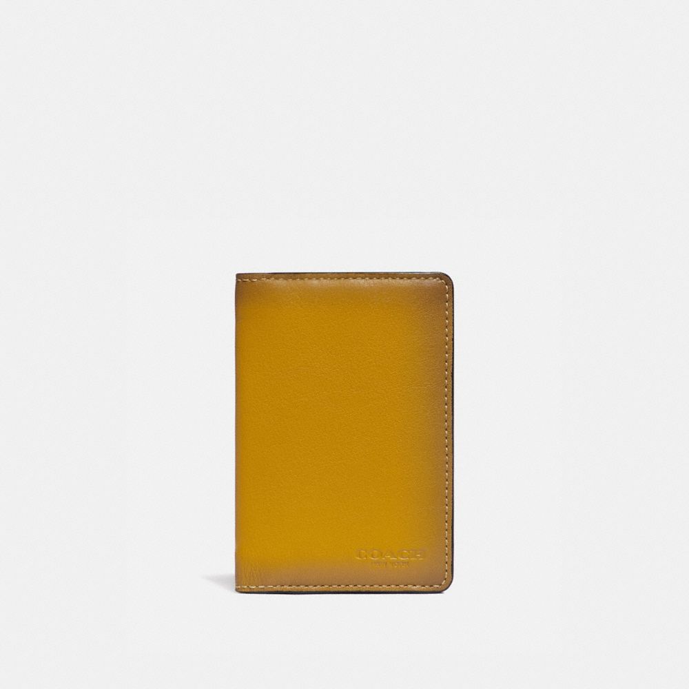 Smooth leather and Signature coated canvas| Four credit card slots| Outside slip pocket| 3" (L) x 4 1/2" (H) x 3/4" (W)