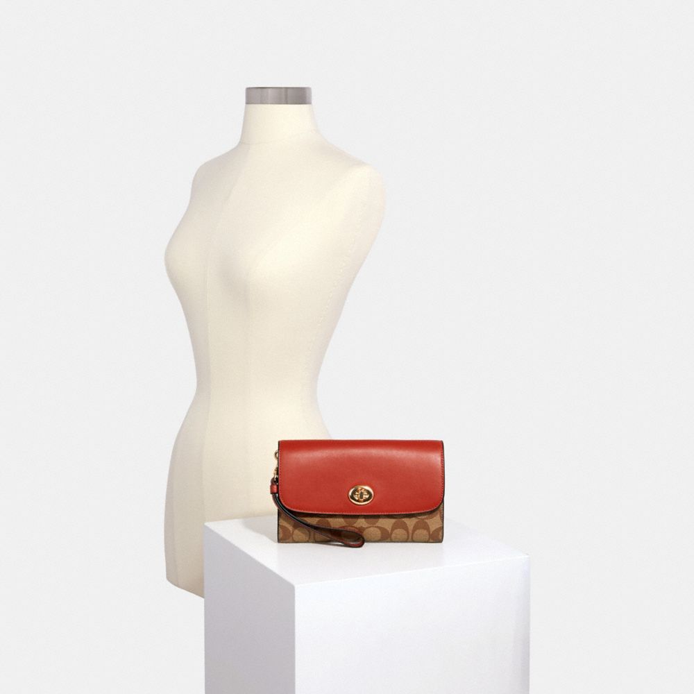 Signature coated canvas and smooth leather| Ten credit card slots| Full-length bill compartment| Inside zip compartment| Turnlock closure, fabric lining| Detachable wrist strap| Outside slip pocket| Detachable long strap with 22" drop for shoulder or crossbody wear| 8" (L) x 5" (H) x 3/4" (W)