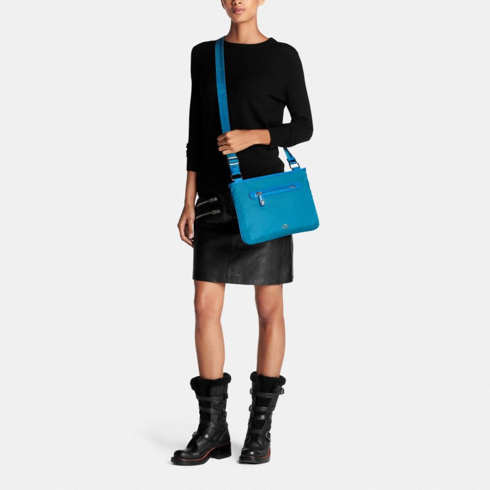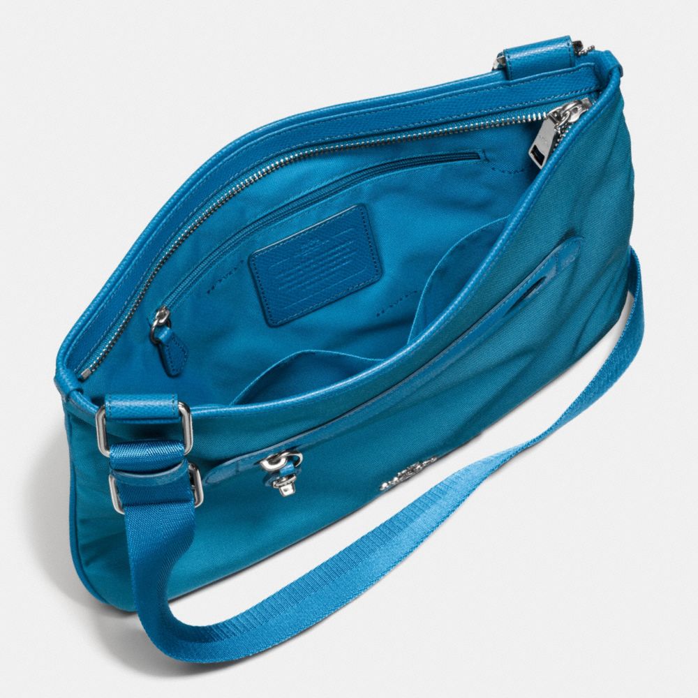 Nylon and soft crossgrain leather| Inside zip, cell phone and multifunction pockets| Zip-top closure, fabric lining| Outside zip and magnetic snap pockets| Adjustable strap with 23 3/4" drop for shoulder or crossbody wear| 13" (L) x 9" (H) x 1 1/4" (W)