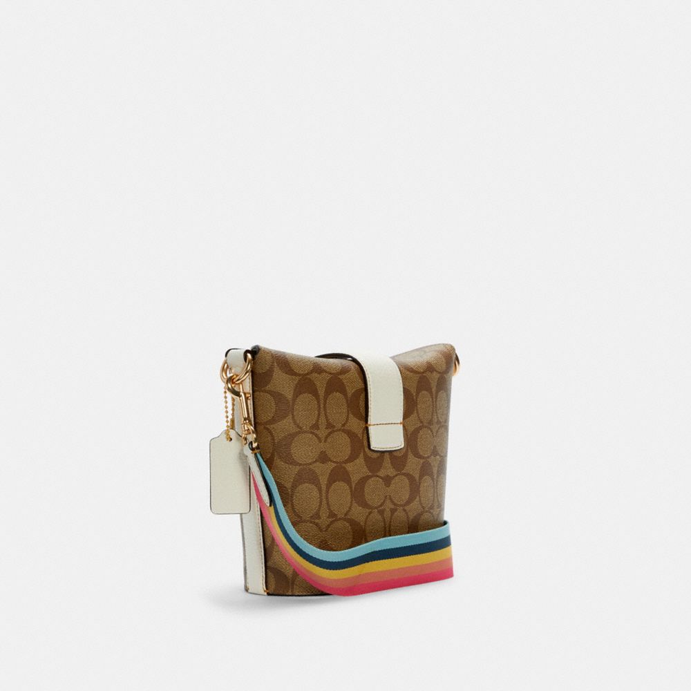 Signature coated canvas and refined pebble leather| Inside multifunction pocket| Turnlock closure, fabric lining| Detachable strap with 22 1/2" drop for shoulder or crossbody wear| 7" (L) x 7" (H) x 3 1/2" (W)| COACH X PEANUTS| Â©ï¸ 2021 PEANUTS WORLDWIDE