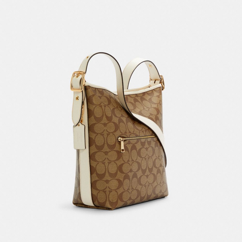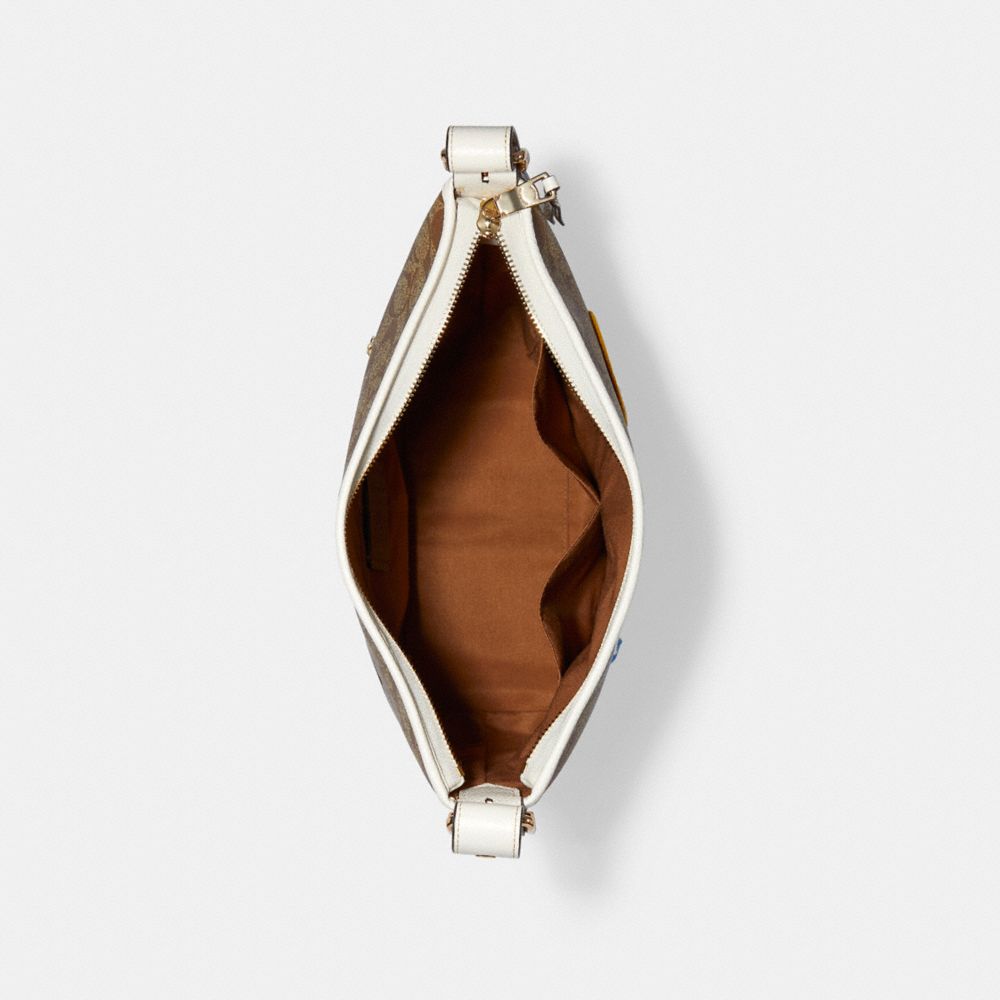 Signature coated canvas and refined pebble leather| Inside zip, cell phone and multifunction pockets| Zip-top closure, fabric lining| Outside zip pocket| Adjustable strap with 21" drop for shoulder or crossbody wear| 9" (L) x 11 1/4" (H) x 1/2" (W)| COACH X PEANUTS| Â©ï¸ 2021 PEANUTS WORLDWIDE
