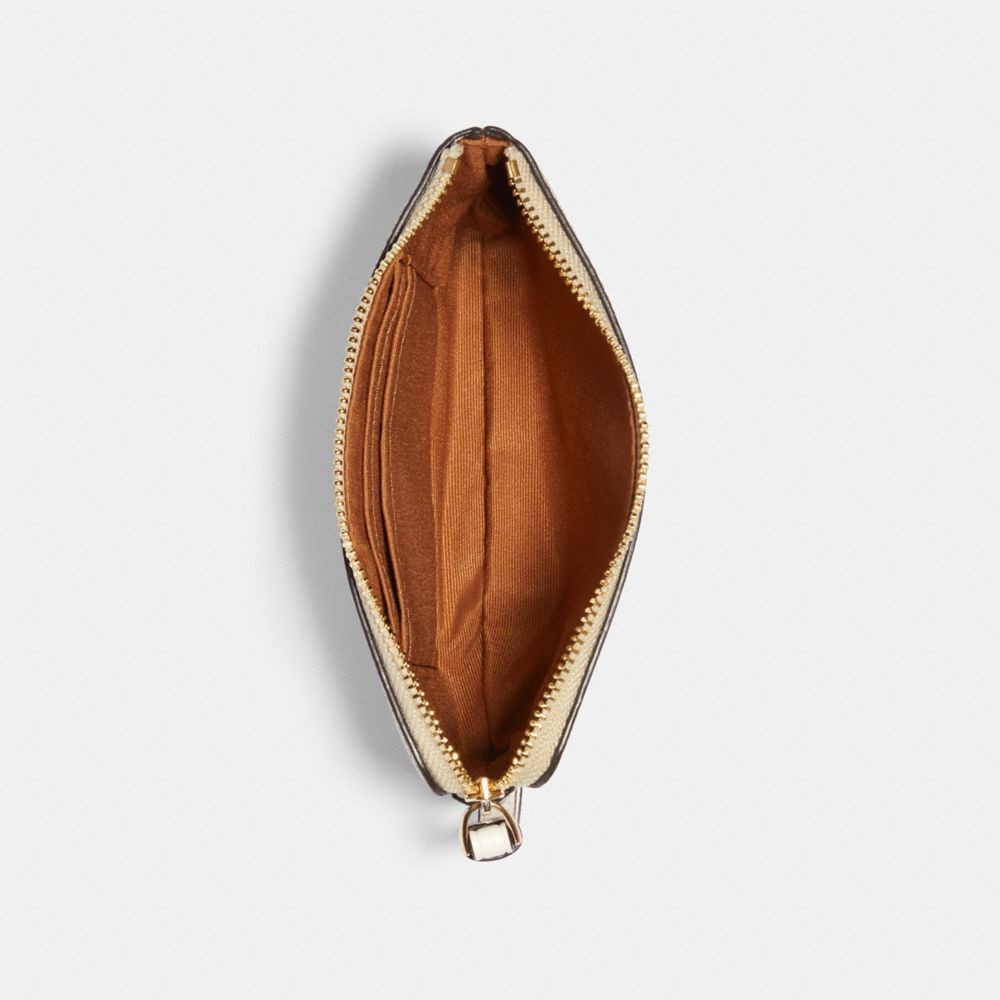 Signature coated canvas with smooth leather details| Two credit card slots| Zip-top closure, fabric lining| Wrist strap attached| 6 1/4" (L) x 4" (H) x 1/2" (W)| Fits an iPhone or Android