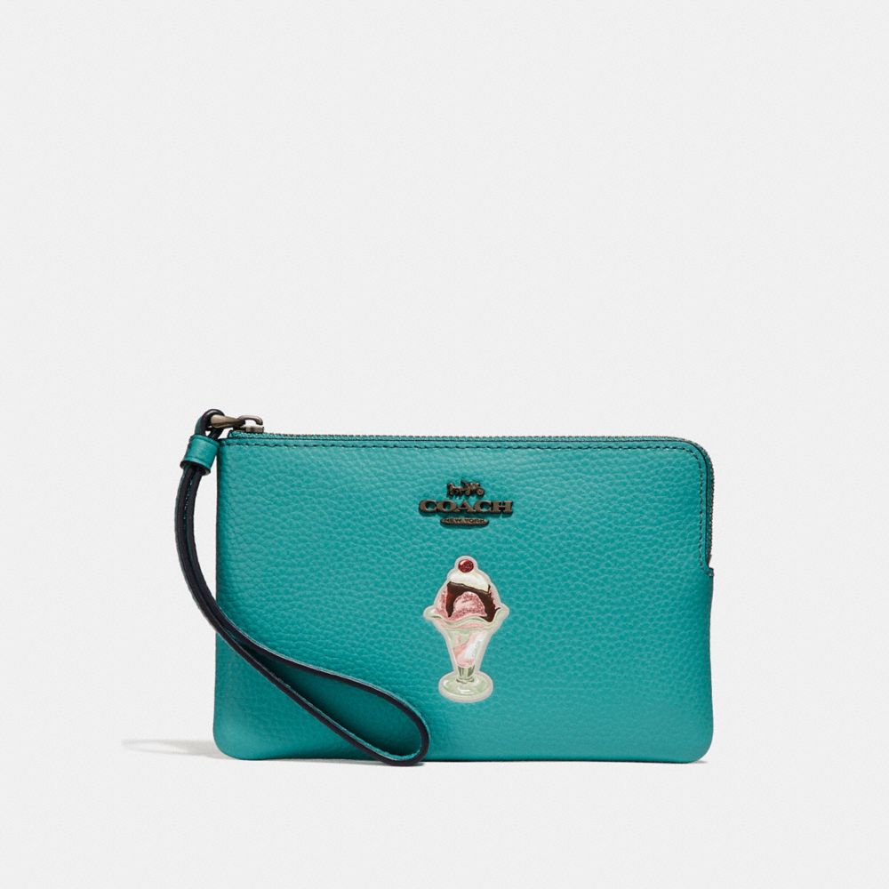 COACH FACTORY OUTLET PRICE CHART - F28385 - CORNER ZIP WRISTLET WITH ICE CREAM SUNDAE MOTIF - BLUE GREEN/BLACK ANTIQUE NICKEL