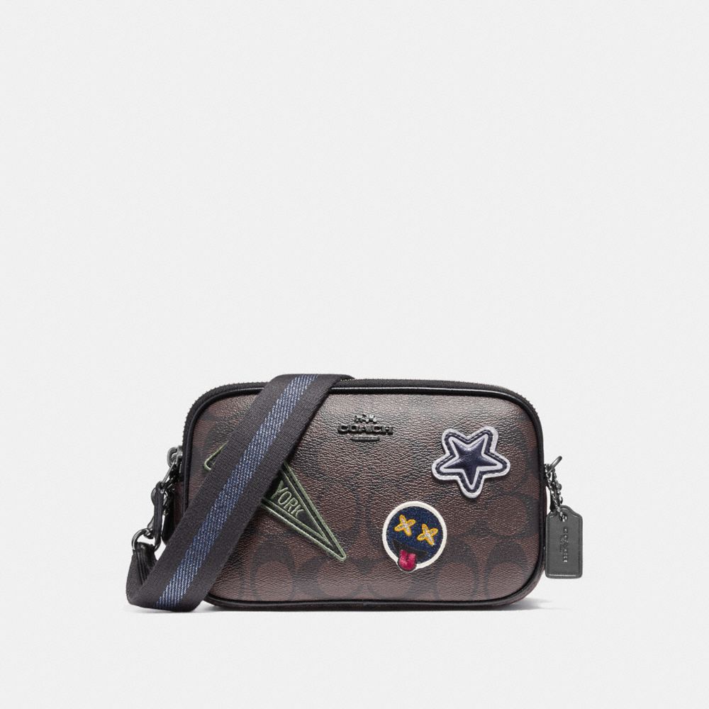 COACH FACTORY OUTLET PRICE CHART - F12084 - CROSSBODY POUCH IN SIGNATURE COATED CANVAS WITH VARSITY PATCHES - BLACK ANTIQUE NICKEL/BROWN