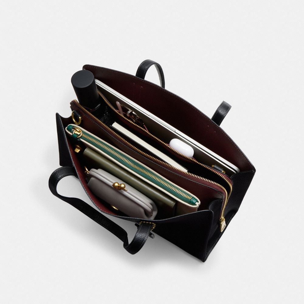 | Polished pebble leather | Inside cell phone and multifunction pockets | Center zip compartment | Handles with 8" drop | Detachable strap with 19 1/2" drop for shoulder or crossbody wear | Four protective feet at base | Fits a 12" laptop | 14" (L) x 10 1/4" (H) x 5" (W)|Style No. CH805|