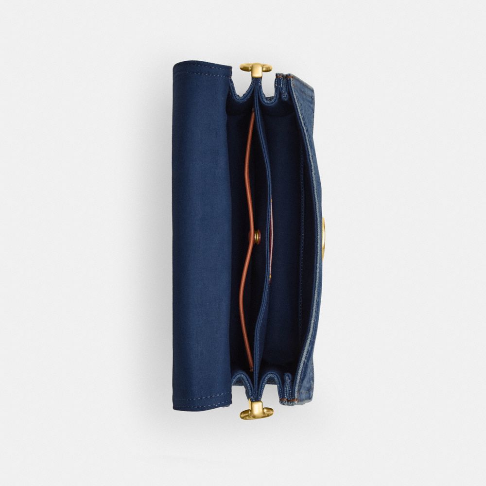 | Denim and refined calf leather | Inside snap and multifunction pockets | Snap closure, fabric lining | Outside zip pocket | Detachable chain strap with 7 3/4" drop | Detachable short strap with 7 3/4" drop | Detachable long strap with 21 1/2" drop for shoulder or crossbody wear | 10 1/4" (L) x 6 1/2" (H) x 3 1/4" (W)|Style No. CAN14|