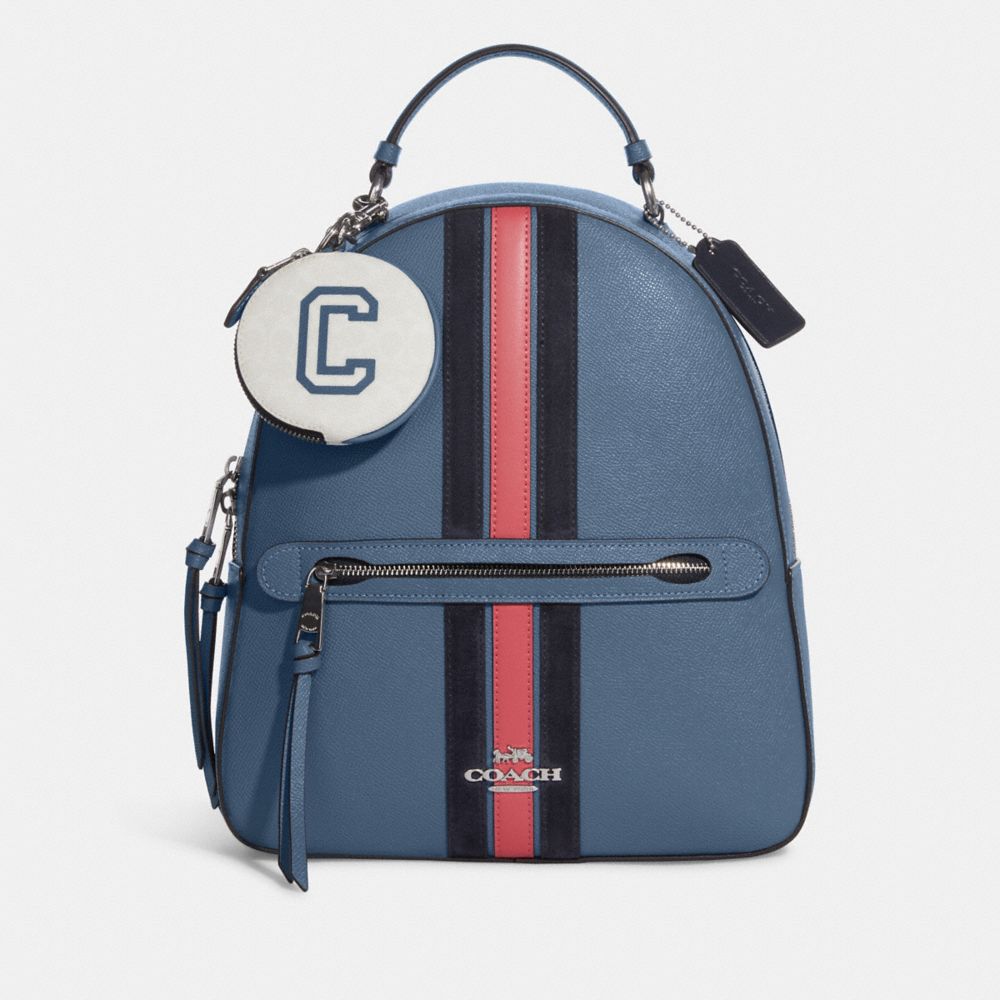 COACH FACTORY OUTLET PRICE CHART - CC049 - CIRCULAR COIN POUCH IN SIGNATURE CANVAS WITH VARSITY MOTIF - SV/CHALK/INDIGO