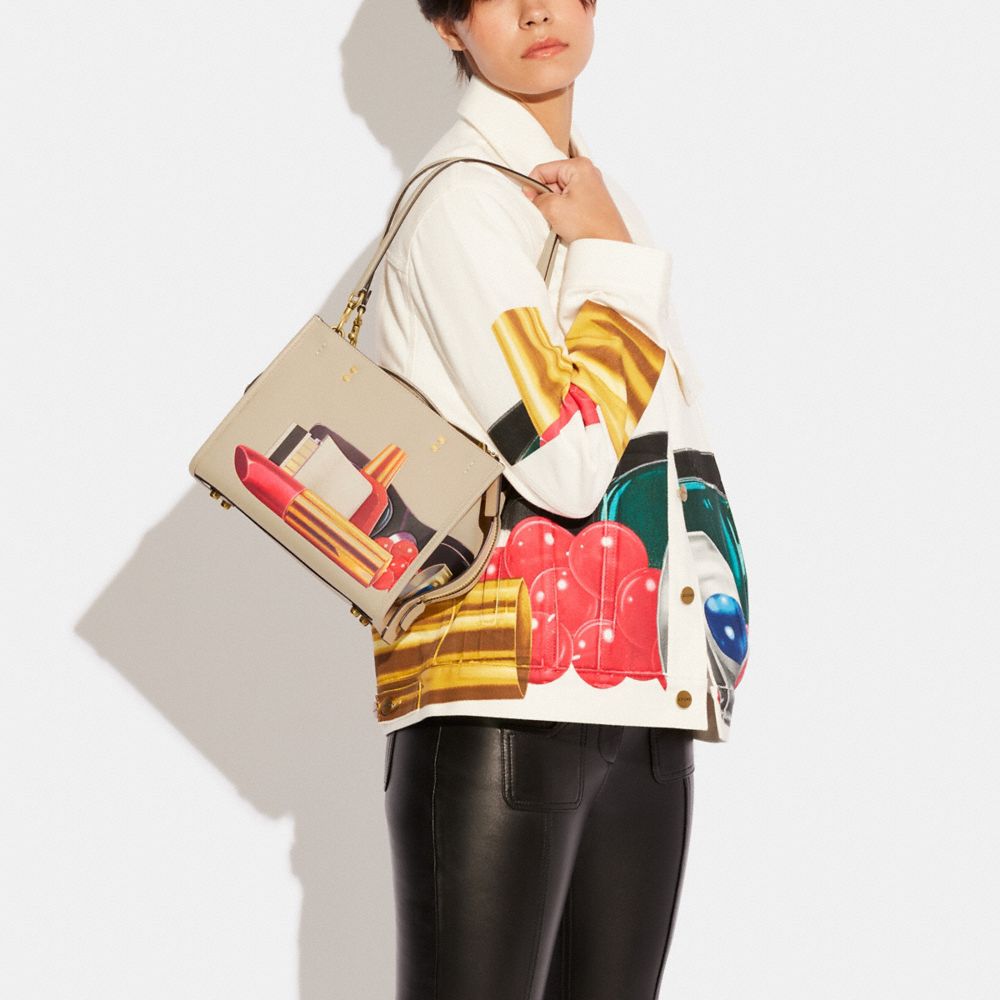 | Glovetanned leather | One credit card slot | Inside snap and multifunction pockets | Zip closure, fabric and leather lining | Two open compartments | Handles with 3 3/4" drop | Detachable straps with 11 1/2" drop for shoulder wear | Detachable long strap with 21 1/2" drop for shoulder or crossbody wear | Four protective feet at base | 9 3/4" (L) x 7 3/4" (H) x 5 1/2" (W) | Coach x Tom Wesselmann | © Estate of Tom Wesselmann. Licensed by Artestar, New York.|Style No. CA126|