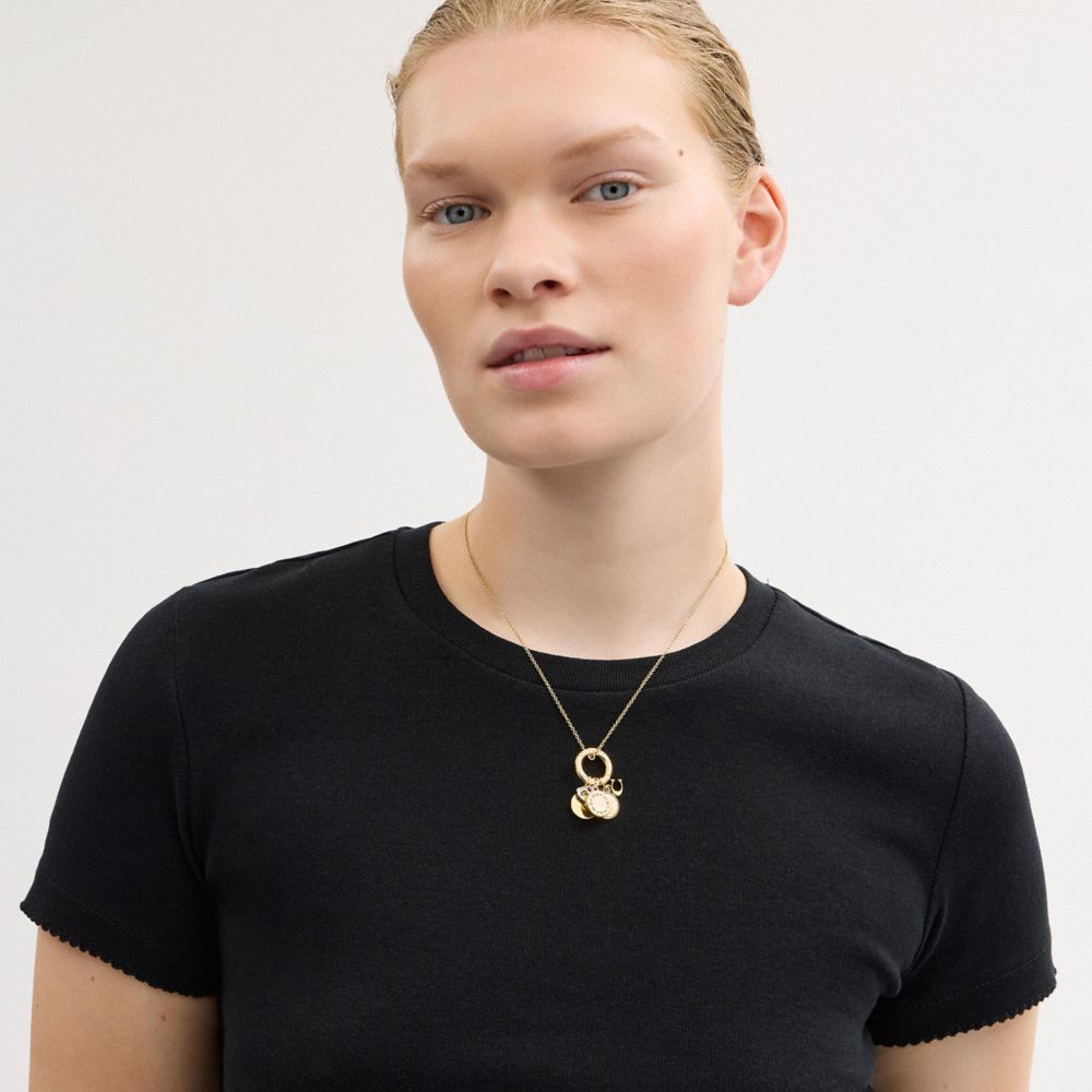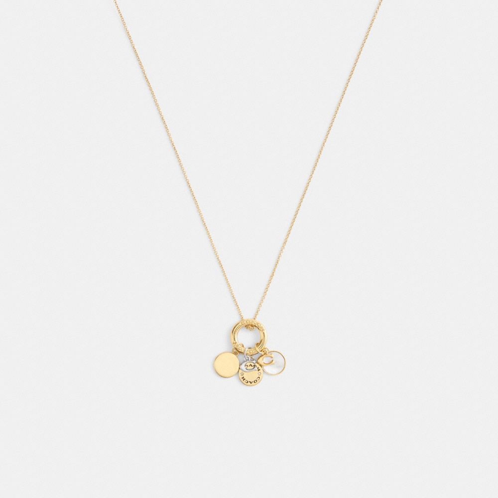 Plated brass, enamel, glass and cubic zirconia | Lobster clasp closure | Circle: 3/4" (L)| Golden coin: 1/2" (L)| Coach coin: 1/2" (L)| Mother of pearl coin: 1/2" (L)| Signature charm: 1/4" (L) x 1/4" (H)| Adjustable 16"–18" (L)|Style No. CBW27