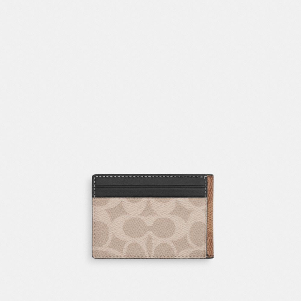 | Signature coated canvas and smooth calf leather | Two inside credit card slots | Inside open pocket | ID window | Two outside credit card slots | Outside open pocket | 4" (L) x 2 3/4" (H)|Style No. CAB82|