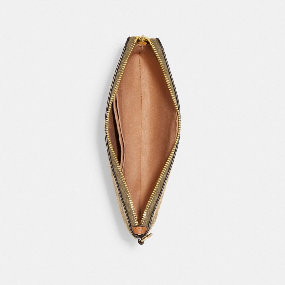 | Signature coated canvas and smooth leather | Inside credit card slots | Zip-top closure, fabric lining | Detachable wrist strap | Large pouch: 7 3/4" (L) x 4 3/4" (H) | Medium pouch: 6 1/4" (L) x 4" (H) | Small pouch: 5" (L) x 3 1/4" (H)|Style No. CJ721|