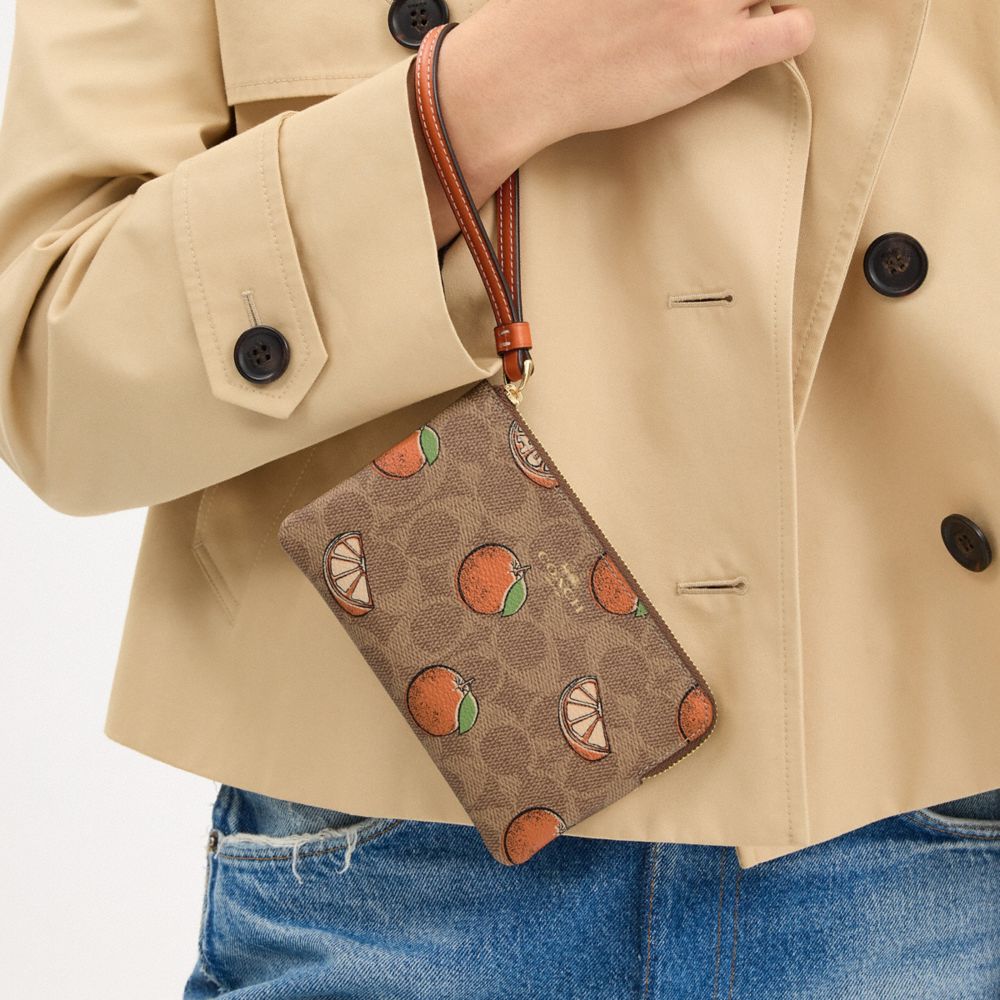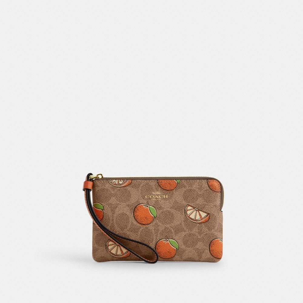 COACH FACTORY OUTLET PRICE CHART - CBB82 - CORNER ZIP WRISTLET IN SIGNATURE CANVAS WITH ORANGE PRINT - GOLD/TAN MULTI
