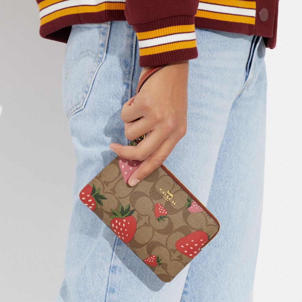 CORNER ZIP WRISTLET IN SIGNATURE CANVAS WITH WILD STRAWBERRY PRINT (COACH CH166)