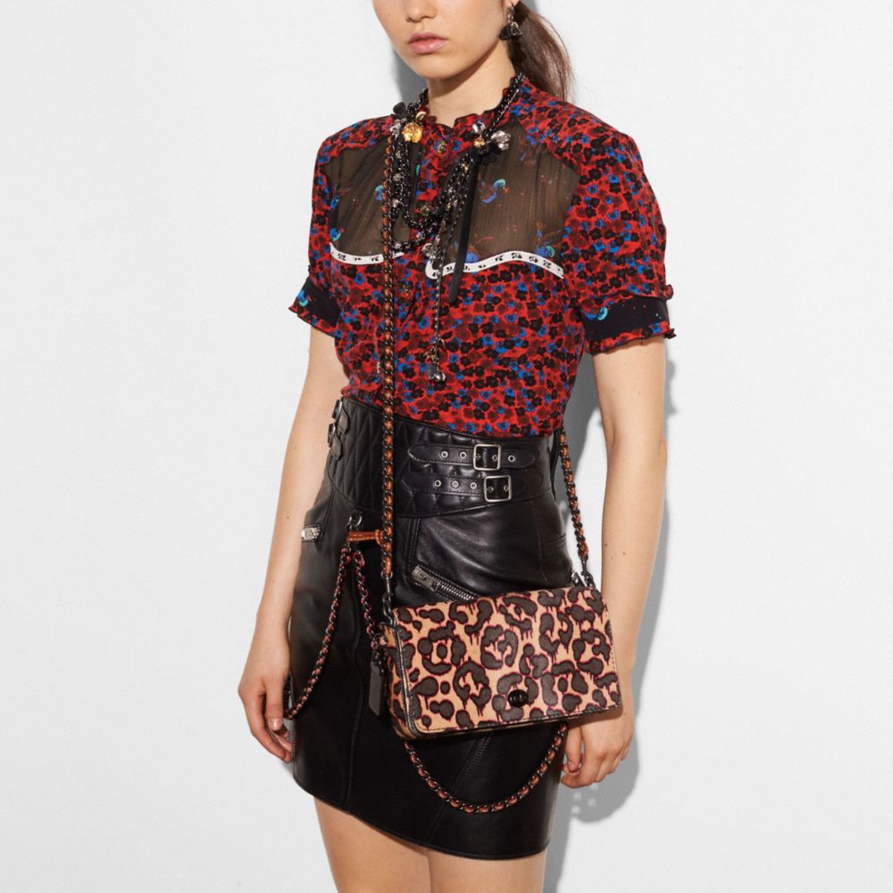 Printed haircalf| Inside open and coin purse pockets| Turnlock closure, leather lining| Outside slip pocket| Detachable strap with 22" drop doubles up for three ways to wear: short or long on the shoulder or crossbody style| 9" (L) x 5" (H) x 2" (W)