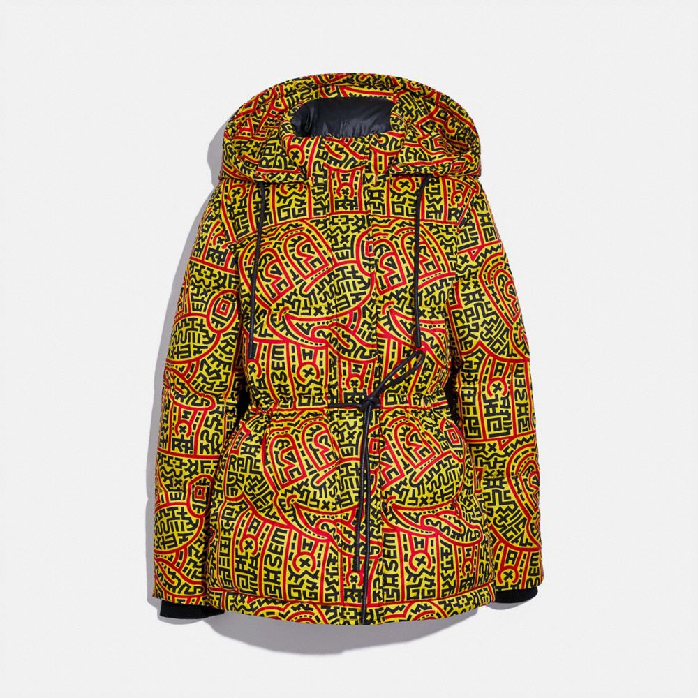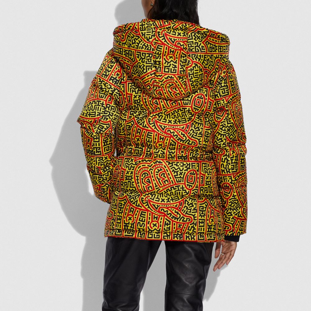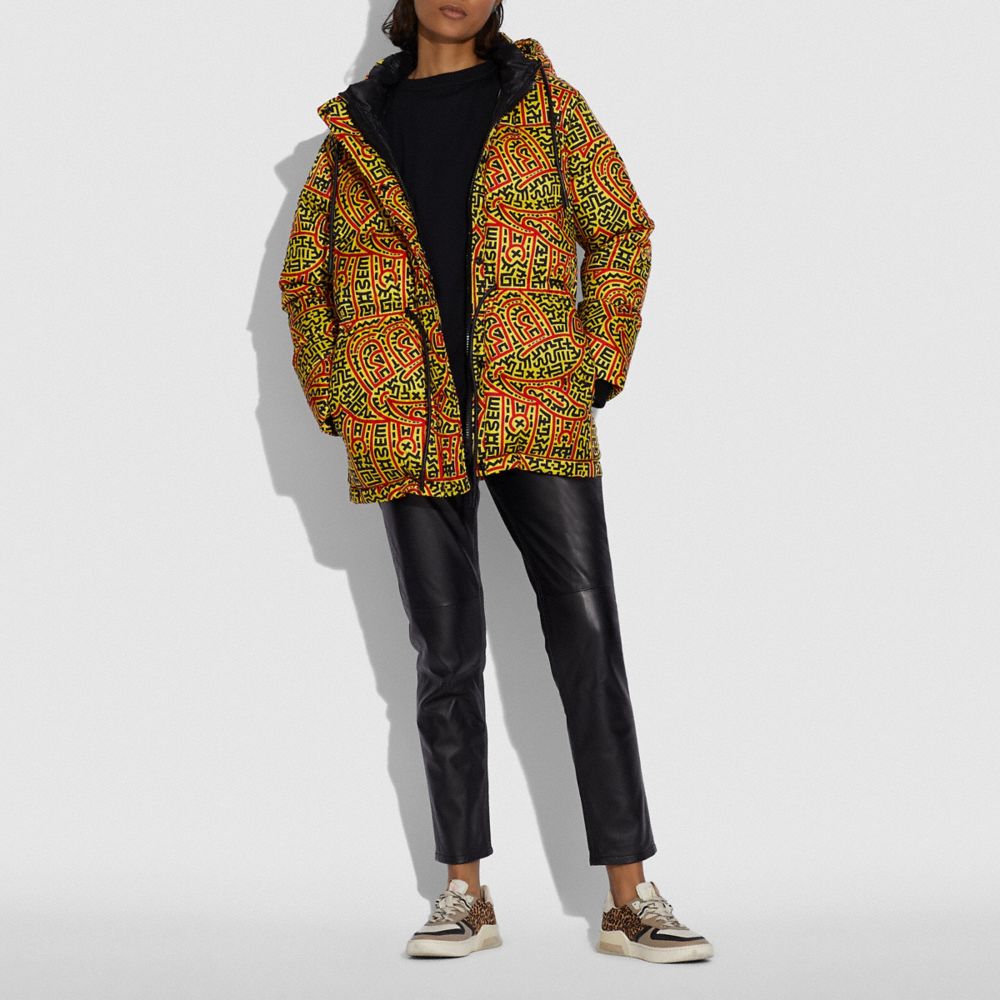 100% polyester| Lining: 100% polyester| Fill: 90% goose down, 10% goose feathers| Leather details| Zip closure| Slip pockets| Length: 30 1/2"| Dry clean| Model is 5'10" (178cm), chest 31" (79cm), waist 24" (61cm), hips 35" (89cm) and wears a size 2| TM & © Disney.| © Keith Haring Foundation.