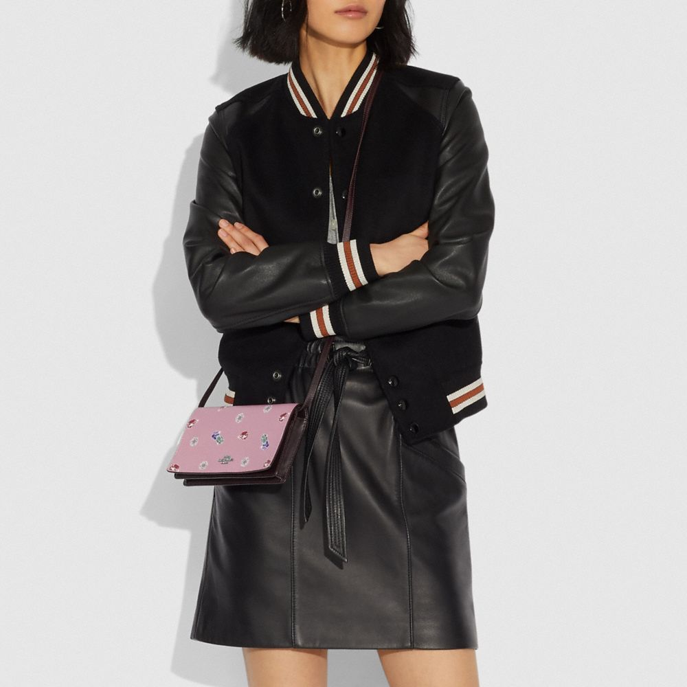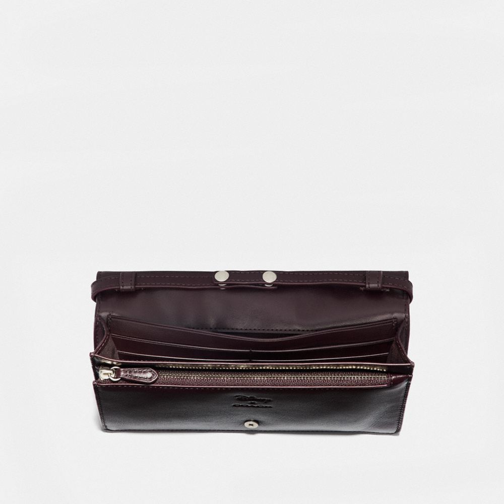 Printed coated canvas with smooth leather details| Eight credit card slots| Full-length bill compartment| Inside zip pocket| Snap closure| Outside slip pocket| Detachable strap with 23" drop for shoulder or crossbody wear| 8" (L) x 4 3/4" (H) x 1 1/2" (W)| Disney x Coach | ©Disney