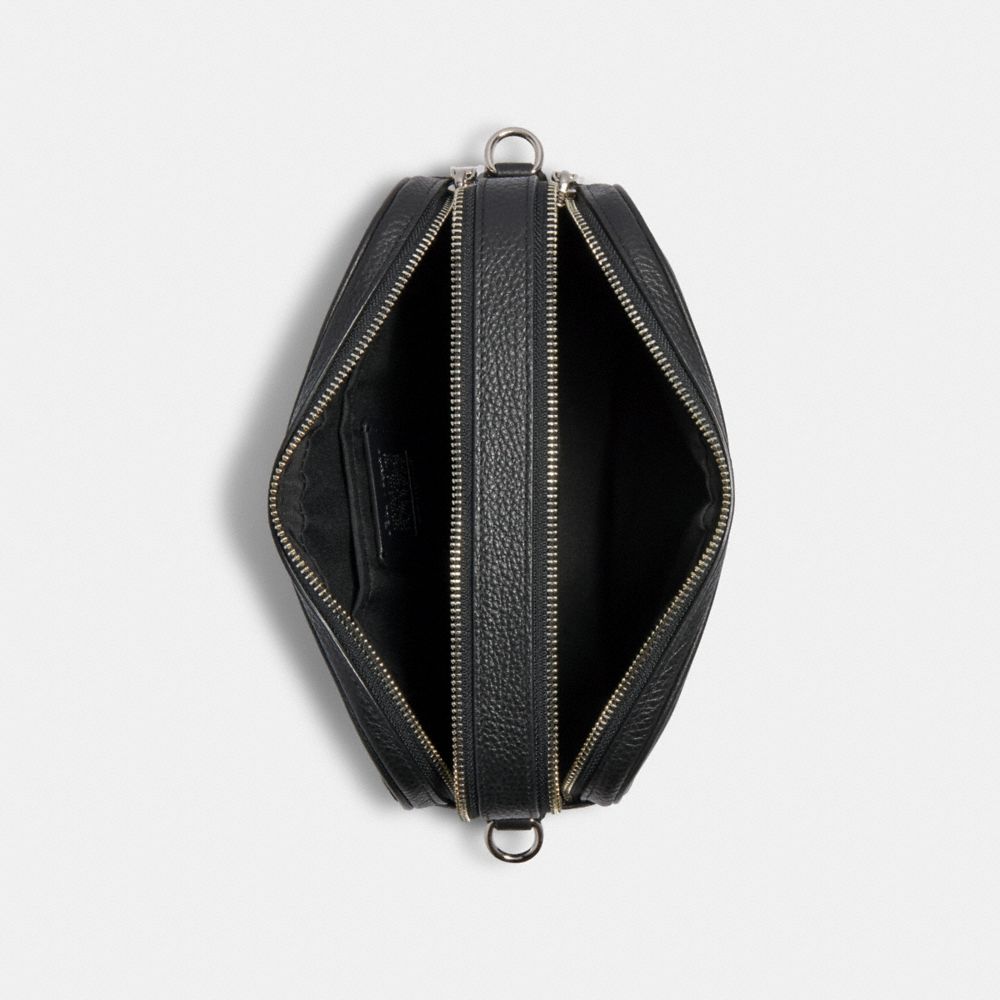 Refined pebble leather and Signature coated canvas| Inside multifunction pocket| Double zip closure, fabric lining| Outside slip pocket| Detachable strap with 22" drop for shoulder or crossbody wear| 9 3/4" (L) 6 1/4" (H) x 3 1/2" (W)| Disney x Coach| ©Disney