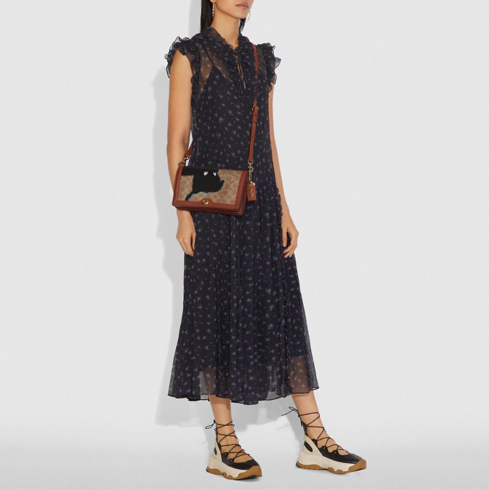Signature coated canvas and refined calf leather| One credit card slot| Inside zip and open pockets| Turnlock closure, fabric lining| Detachable strap with 22" drop for shoulder or crossbody wear| Instantly change the look of your bag with an interchangeable strap.| 9 3/4" (L) x 6" (H) x 1 3/4" (W)| Disney x Coach| ©Disney