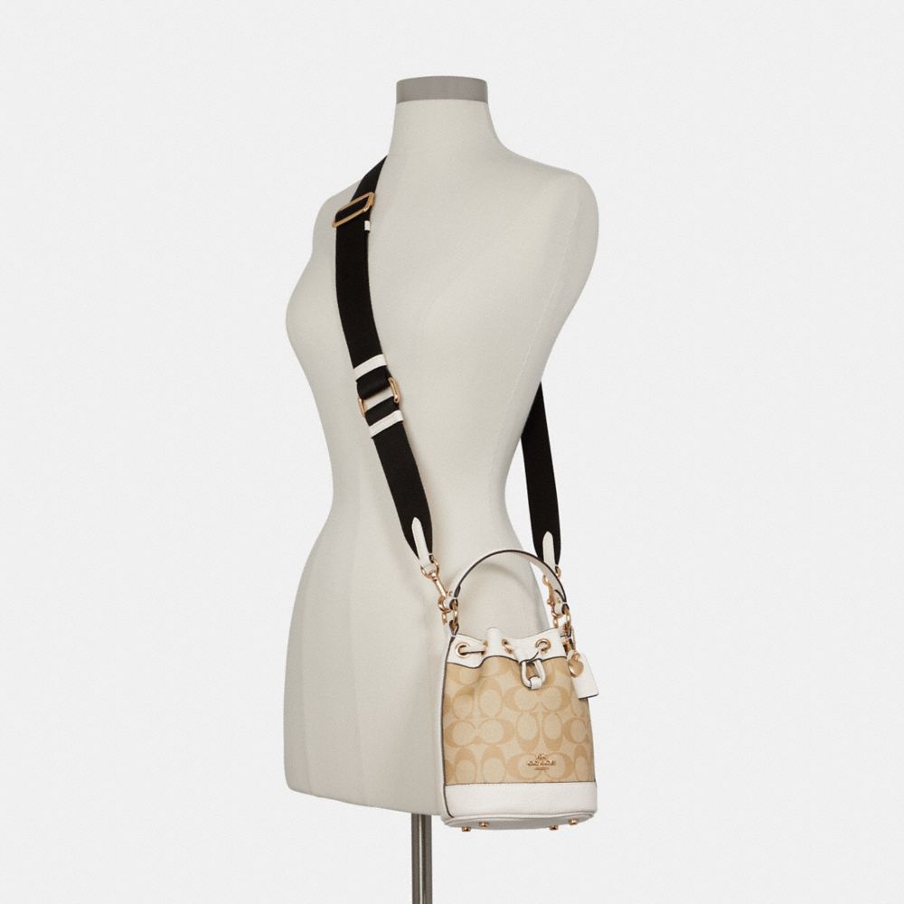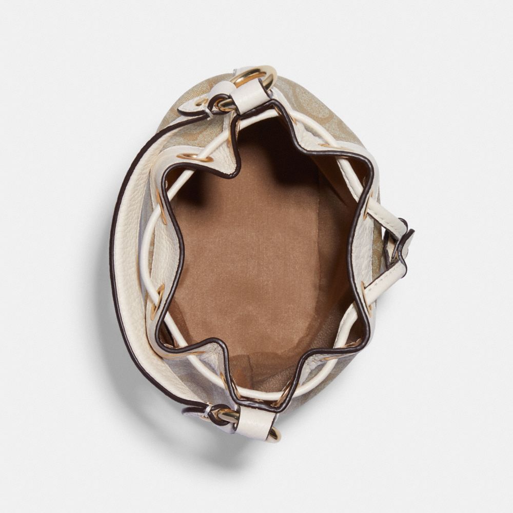 Signature coated canvas and refined pebble leather| Inside multifunction pocket| Drawstring closure, fabric lining| Handle with 4" drop| Detachable strap with 27" drop for shoulder or crossbody wear| Four protective feet at base| 6" (L) x 7" (H) x 4" (W)Style No. C8069