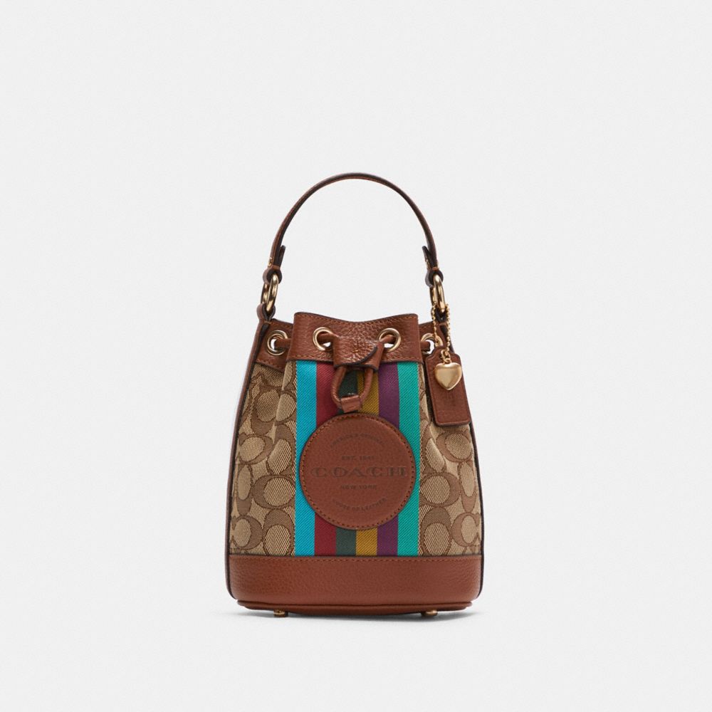 COACH FACTORY OUTLET PRICE CHART - C5639 - DEMPSEY DRAWSTRING BUCKET 15 IN SIGNATURE JACQUARD WITH STRIPE AND COACH PATCH - GOLD/KHAKI/REDWOOD MULTI