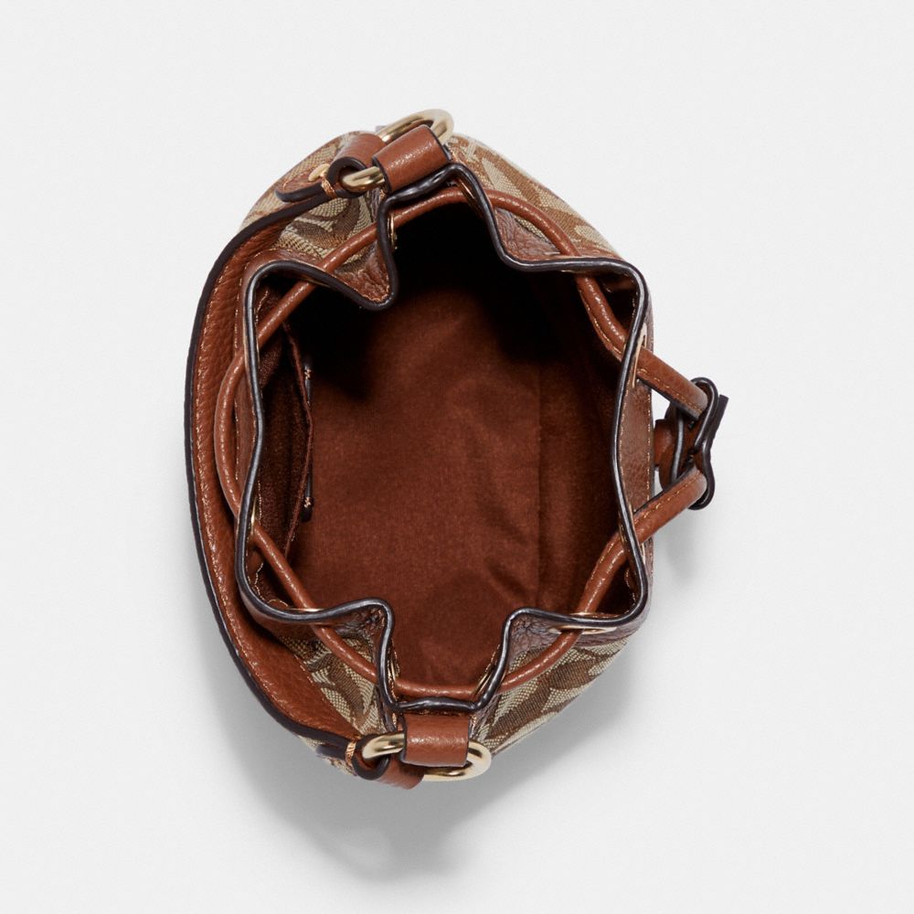 Signature jacquard and refined pebble leather| Inside multifunction pocket| Drawstring closure, fabric lining| Handle with 4" drop| Detachable strap with 27" drop for shoulder or crossbody wear| Four protective feet at base| 6" (L) x 7" (H) x 4" (W)Style No. C5639