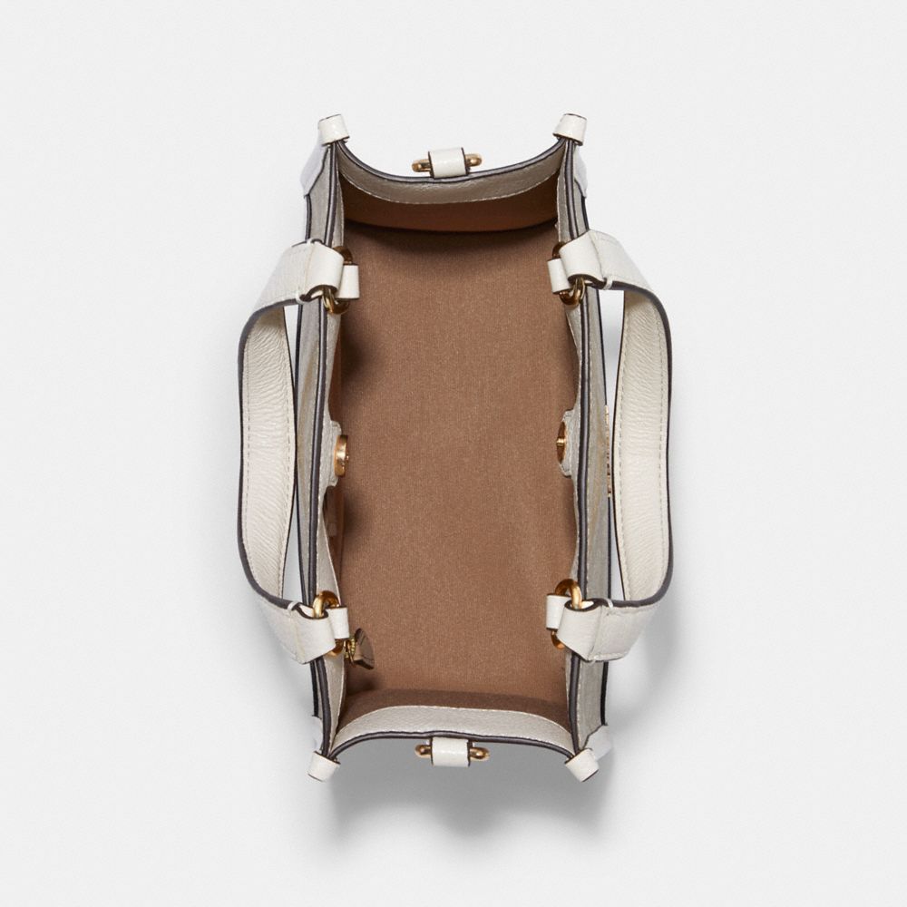 Signature coated canvas and refined pebble leather| Inside zip and multifunction pockets| Snap closure, fabric lining| Handles with 4 1/4" drop| Detachable strap with 22 1/2" drop for shoulder or crossbody wear| Four protective feet at base| 8 3/4" (L) x 7 3/4" (H) x 4 1/4" (W)Style No. C5122