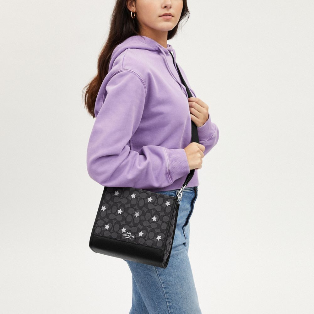 | Signature jacquard and refined pebble leather | Inside zip and multifunction pockets | Snap closure, fabric lining | Handles with 4 1/4" drop | Detachable strap with 22 1/2" drop for shoulder or crossbody wear | 8 3/4" (L) x 7 3/4" (H) x 4 1/4" (W)|Style No. CO972|