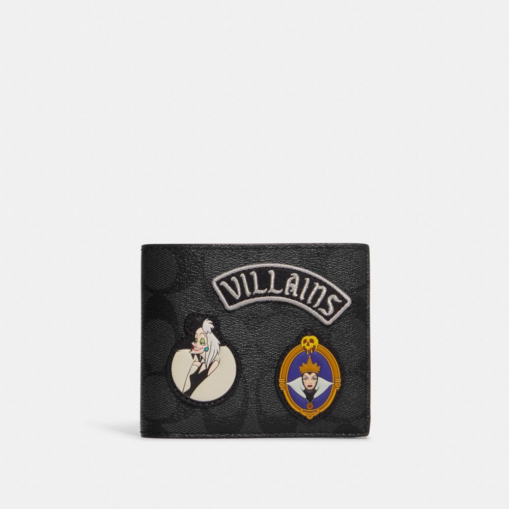 | Signature coated canvas and smooth leather | Eight credit card slots | Full-length bill compartments | Removable insert with ID window and two credit card slots | 4 1/4" (L) x 3 3/4" (H) x 3/4" (W) | Part of a special collaboration where Disney's most iconic villains meet iconic Coach design | Disney x Coach | © Disney|Style No. CC095|