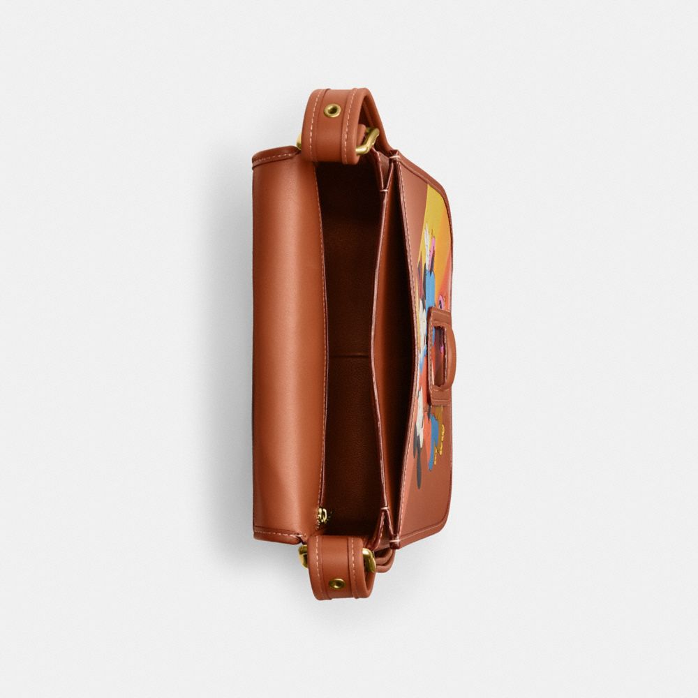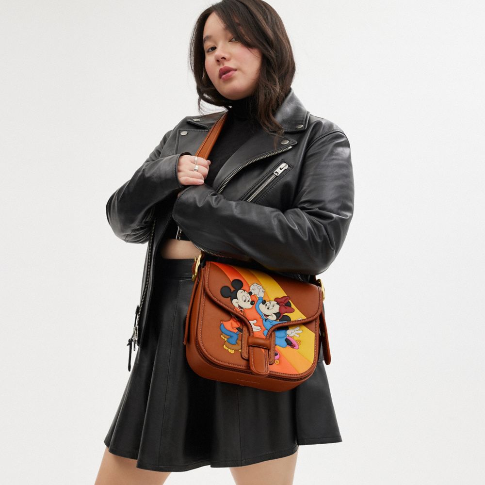 | Glovetanned leather | Inside zip and snap pockets | Flap closure, leather lining | Outside slip pocket | Adjustable strap with 14" drop for shoulder wear | 9 1/2" (L) x 8" (H) x 4" (W) | Disney x Coach | ©Disney|Style No. CQ801|