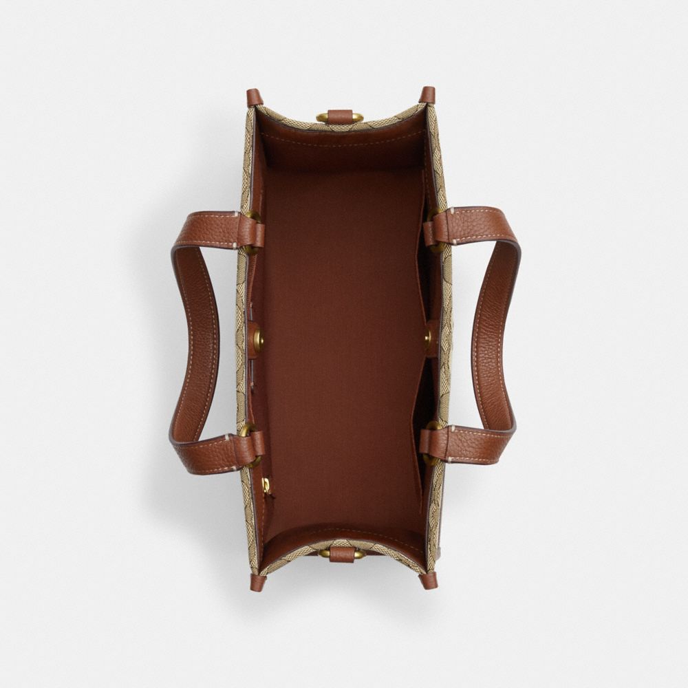 | Signature jacquard and refined pebble leather | Inside zip, cell phone and multifunction pockets | Snap closure, fabric lining | Handles with 5 1/4" drop | Detachable strap with 20" drop for shoulder or crossbody wear | 11 1/2" (L) x 8 3/4" (H) x 5" (W) | This Coach piece is crafted of our Signature jacquard made from a blend of organic cotton and recycled polyester | Disney x Coach | ©Disney|Style No. CM198|