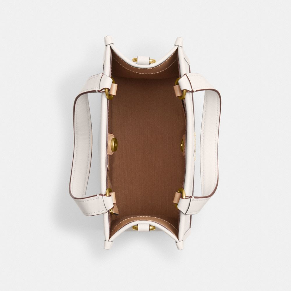 | Refined calf leather | Inside zip and multifunction pockets | Snap closure, fabric lining | Handles with 4 1/4" drop | Detachable strap with 22 1/2" drop for shoulder or crossbody wear | Four protective feet at base | 8 3/4" (L) x 7 3/4" (H) x 4 1/4" (W) | Disney x Coach | ©Disney|Style No. CM843|
