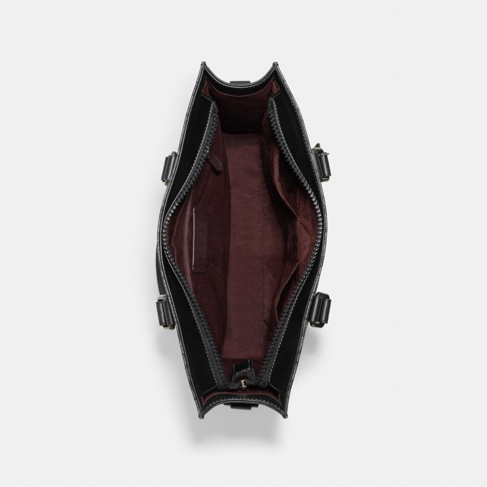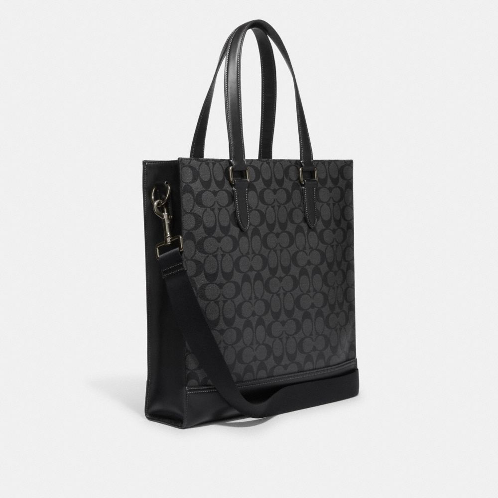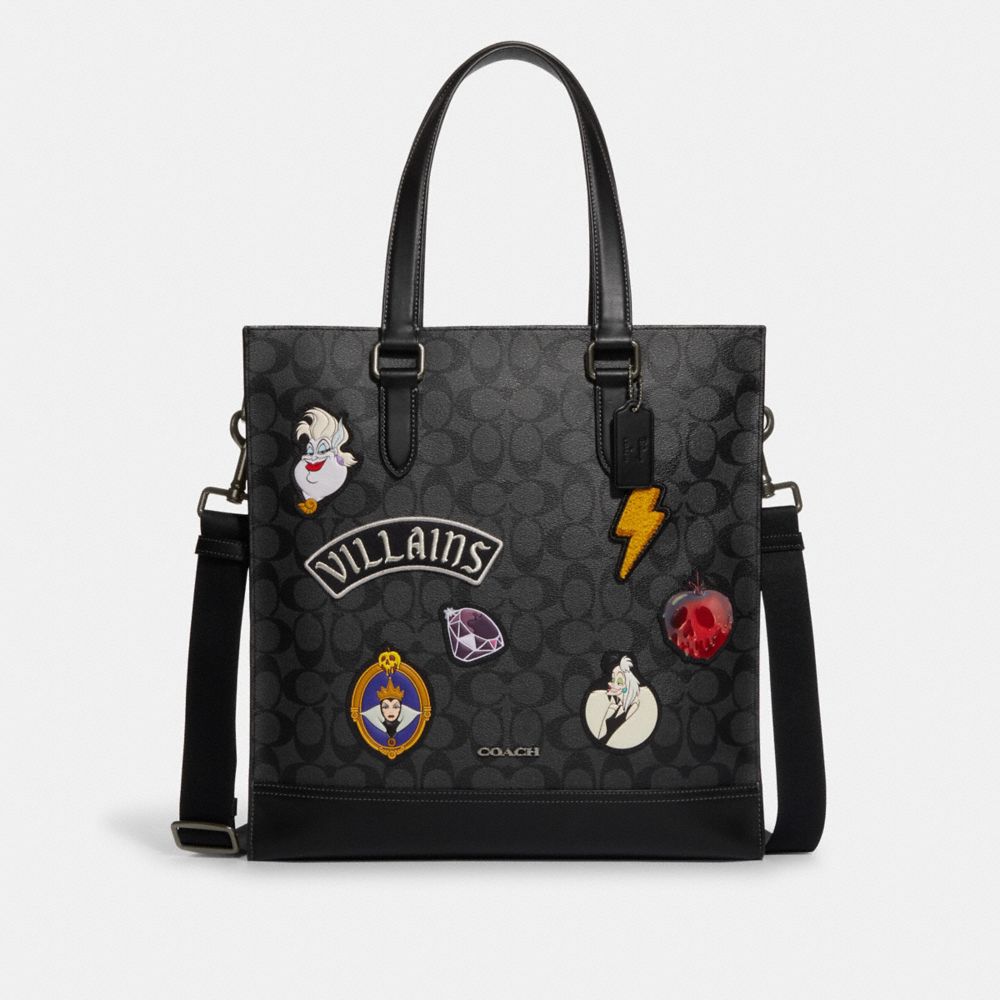 | Signature coated canvas and smooth calf leather | Inside zip, cell phone and multifunction pockets | Zip-top closure, fabric lining | Handles with 7 3/4" drop | Detachable strap with 21" drop for shoulder or crossbody wear | 14" (L) x 14 1/2" (H) x 3 1/4" (W) | Part of a special collaboration where Disney's most iconic villains meet iconic Coach design | Disney x Coach | © Disney|Style No. CC559|