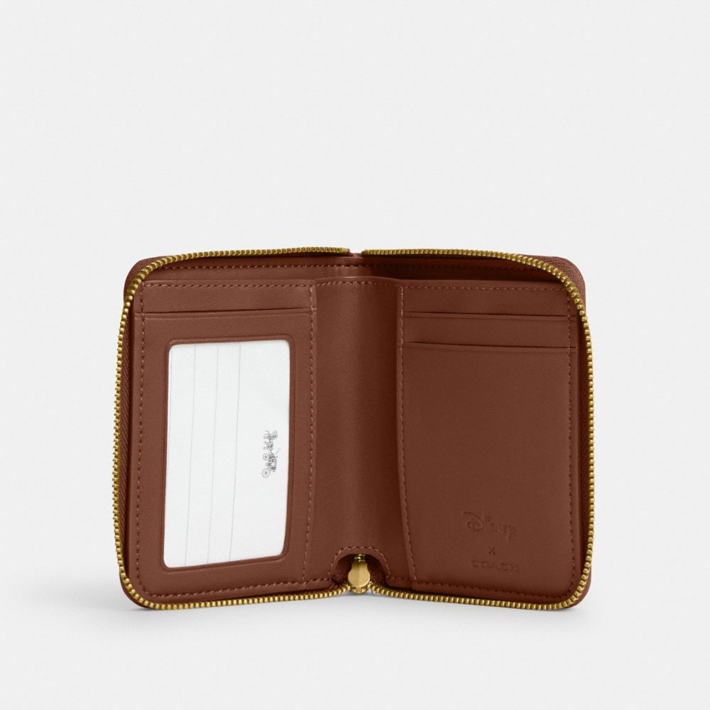 | Signature jacquard and refined pebble leather | Two credit card slots | ID window | Bill compartment | Zip-around closure | 4 1/2" (L) x 3 3/4" (H) x 3/4" (W) | This Coach piece is crafted of our Signature jacquard made from a blend of organic cotton and recycled polyester | Disney x Coach | ©Disney|Style No. CN035|