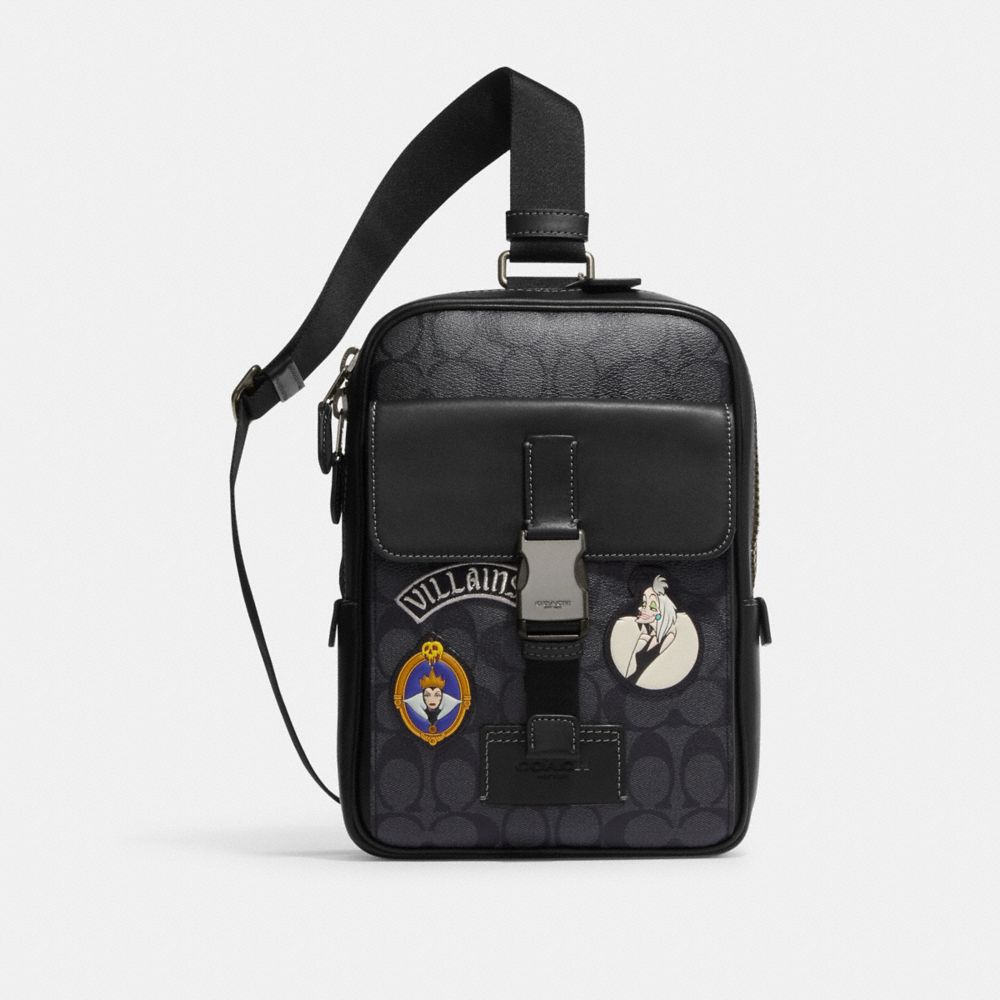 | Signature coated canvas and smooth calf leather | Inside zip pocket | Zip closure, fabric lining | Outside pocket with speedclip closure | Adjustable shoulder strap for crossbody wear | 7 1/4" (L) x 10 3/4" (H) x 2 1/4" (W) | Part of a special collaboration where Disney's most iconic villains meet iconic Coach design | Disney x Coach | © Disney|Style No. CC113|