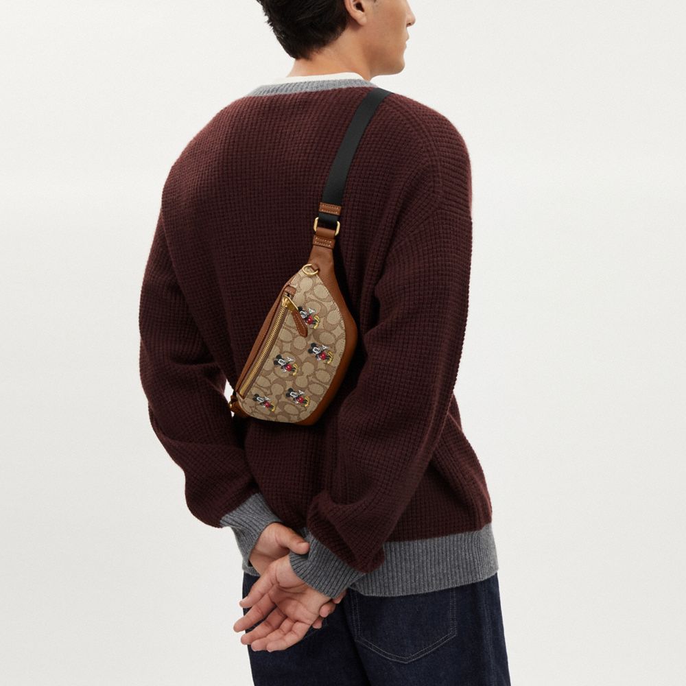 | Signature jacquard and refined pebble leather | Zip closure, fabric lining | Outside zip pocket | Adjustable strap with 49" length for wear at waist | 11 1/2" (L) x 4 3/4" (H) x 2" (W) | This Coach piece is crafted of our Signature jacquard made from a blend of organic cotton and recycled polyester | Disney x Coach | ©Disney|Style No. CL961|