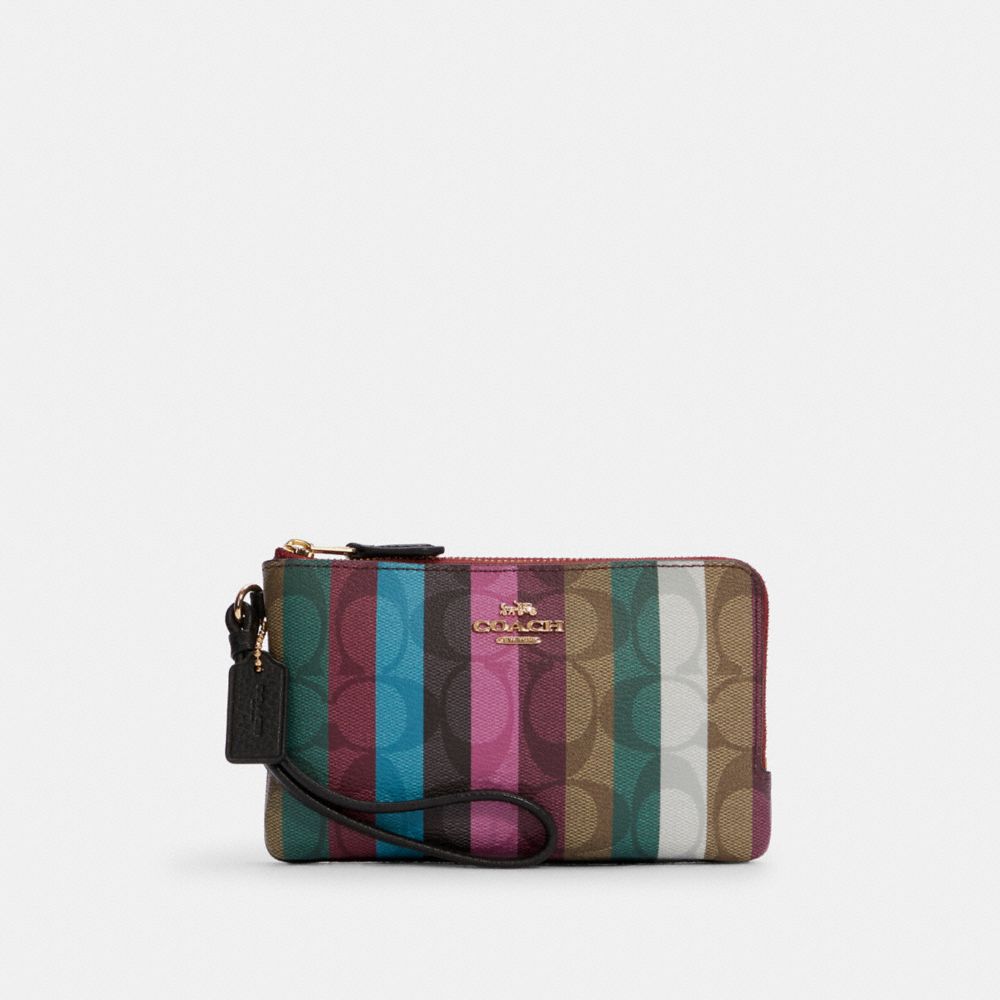COACH FACTORY OUTLET PRICE CHART - C6022 - DOUBLE CORNER ZIP WRISTLET IN SIGNATURE CANVAS WITH STRIPE PRINT - GOLD/KHAKI MULTI