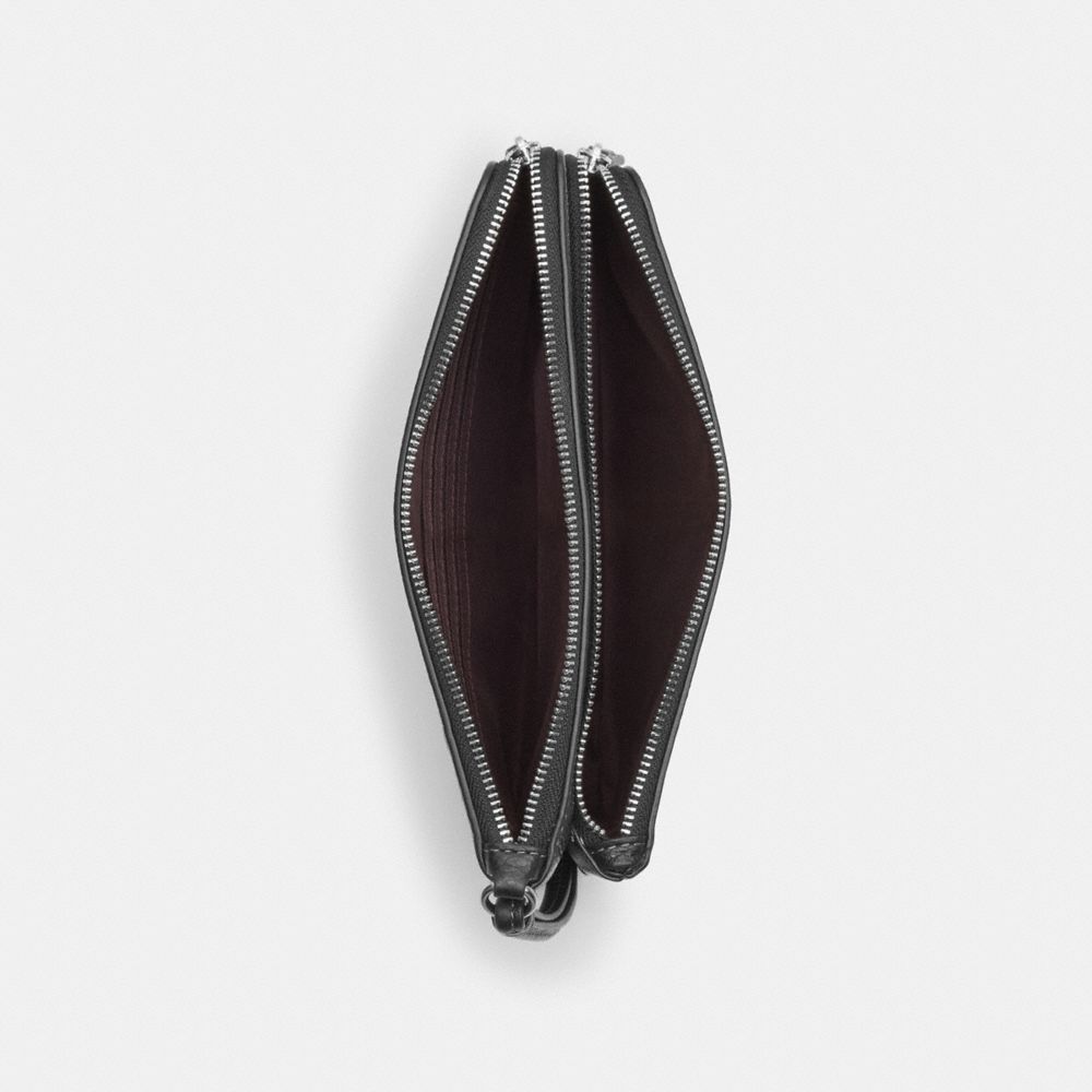 | Printed coated canvas and refined pebble leather | Eight credit card slots | Inside open pockets | Double zip closure, fabric lining | Wrist strap attached | 8" (L) x 4 3/4" (H) x 1" (W) | Fits all phone sizes up to an iPhone X and Samsung S7 Edge|Style No. CP408|